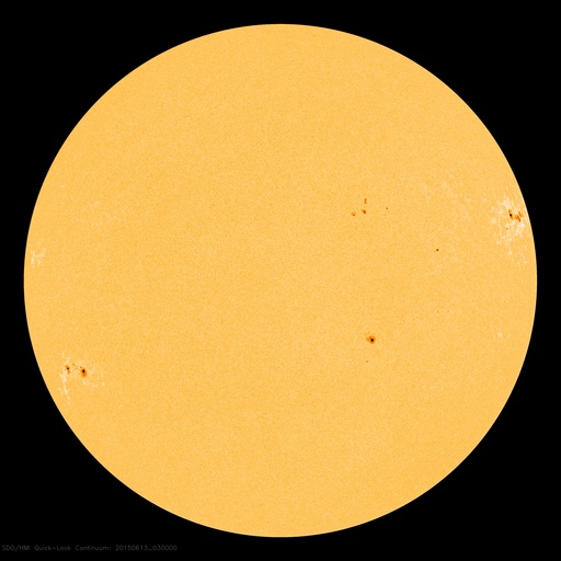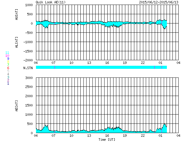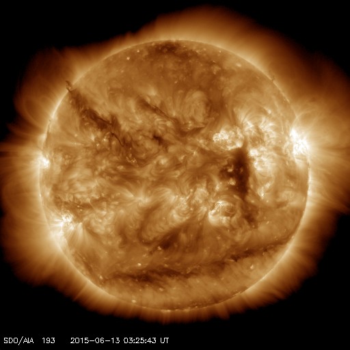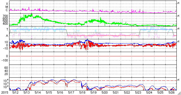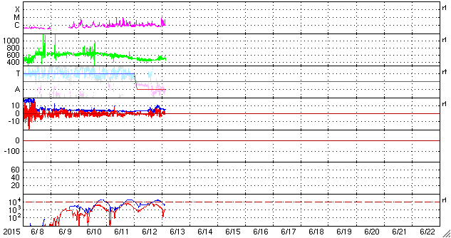 2015/ 6/13 12:32 更新 2360黒点群でCクラスのフレアが続いています。太陽風は高速です。 担当 篠原 昨日のニュースの後、太陽のフレアの発生は少し落ち着いて、 西(右)の2360群と、東(左)の2367群で、 C1〜3台の比較的小さいCクラスフレアが 6回起きる程度でした。 しかし、今朝から2360群の活動度が上がり、 13日8時半(世界時12日23時半)のC8.7に始まって、 C5.9、C3.5、C6.0と、 Cクラス後半のフレアを連続させています。 2360群はもうすぐ西の端の向こう側に隠れてしまいますが、 それまで注目して下さい。 太陽風の速度は、昨夜にかけて480km/秒に下がりましたが、 今日に入った頃から、また500km/秒に上がっています。 その頃に、磁場強度も10nTに強まる変化が見られましたが、 すぐに終わって、現在は5nTと平均的な値です。 磁場の南北成分は、0nT付近にあり、 南向きは小さく変化する程度です。 このため、磁気圏も比較的穏やかで、 AE指数のグラフは、小規模の変化が時々起きている程度です。 SDO衛星AIA193の太陽写真では、 コロナホールは更に西に進んでいます。 明日くらいからこの領域の影響が 地球に達する可能性があります。 太陽風の磁場や速度が高まって、 それによりオーロラ活動が強められる可能性があります。 放射線帯の高エネルギー電子も、 10,000を超えて高いレベルを保っています。 ![]() SDO衛星のAIA193カメラによる太陽コロナの様子 (c) SDO (NASA) ![]() SDO衛星による太陽の可視光写真。マウスの矢印を写真に重ねると、黒点番号付きの写真に切り替わります。 (c) SDO (NASA) ![]() GOES衛星の太陽X線データ (c) NOAA/SWPC ![]() ACEが観測した太陽風の磁場(1番上の枠、白線は全体の強度、赤線は南北成分) および、太陽風の密度(3番目の橙線)、速度(4番目の黄線) (c) NOAA/SWPC ![]() リアルタイムAE指数 下段のAEグラフの値が高くなると、オーロラ活動が活発化しています。 (c) 京都大学, NICT ![]() 27日の太陽周期に合わせたデータプロット 太陽が同じ面を地球に向けていた27日前の変化から、今後を予想することができます。 (c) 作図:宇宙天気ニュース