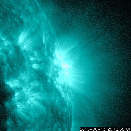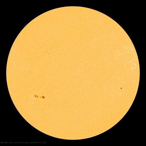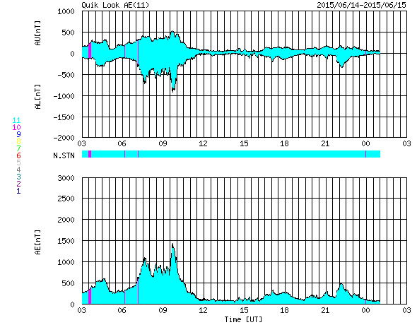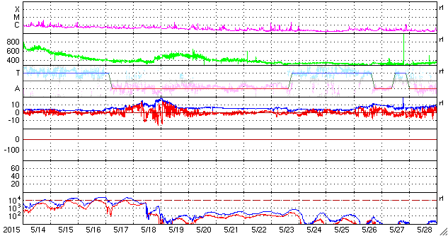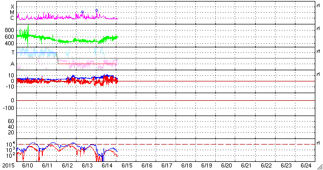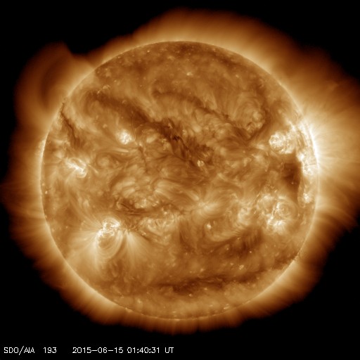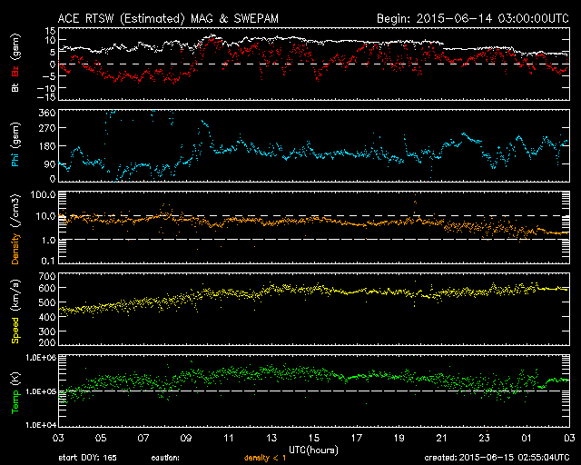 2015/ 6/15 11:55 更新 太陽は穏やかになっています。600km/秒の高速太陽風が到来しました。 担当 篠原 昨日、M2.0の中規模フレアを起こした2360黒点群は、 その後も小さい活動を続けながら、西の端の向こう側に回り、 見えなくなりました。 隠れていく様子を、SDO衛星AIA131の動画で紹介します。 2360群が隠れた後は、 南東(左下)の2367群で、C1.2、C1.3の小さいフレアが起きた程度で、 X線のグラフは静かになっています。 太陽風は、昨日のニュース以降に速度が上がり始め、 夜には、600km/秒の高速風に達し、現在まで続いています。 磁場強度も、速度とともに10nT近くまで強まりましたが、 今朝に入って下がり、現在は5nTと平均的な強さです。 27日周期の図を見ると、 前周期より半日ほど速度の変化が早く始まっています。 また、前回の最高速度は550km/秒だったので、 今回はそれを上回っています。 磁場の南北成分は、速度が上がる頃は南寄りでしたが、 600km/秒に達した頃から北寄りに切り替わっています。 このため、オーロラの活動度を表すAE指数のグラフは、 前半に1000nTを越える大きな変化が発生していますが、 中盤以降は変化が小さくなっています。 太陽風は、高速の状態が続いているので、 磁場の傾向が再び南寄りに切り替わると、 磁気圏の活動も再び高まるでしょう。 前周期の高速風は、2日ほど続きました。 今回も同程度とすると、 明日には速度が下がるかもしれません。 放射線帯の高エネルギー電子は、低下していて、 1000程度に下がっています。