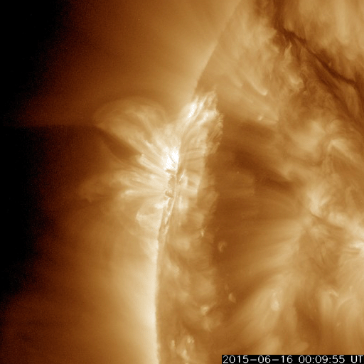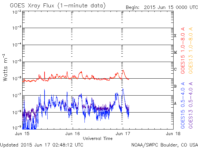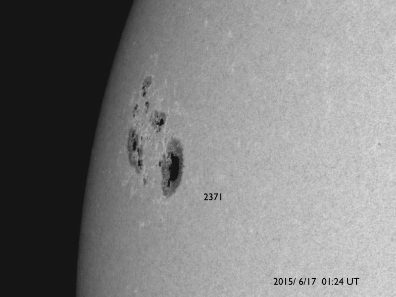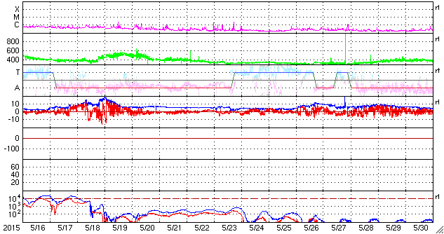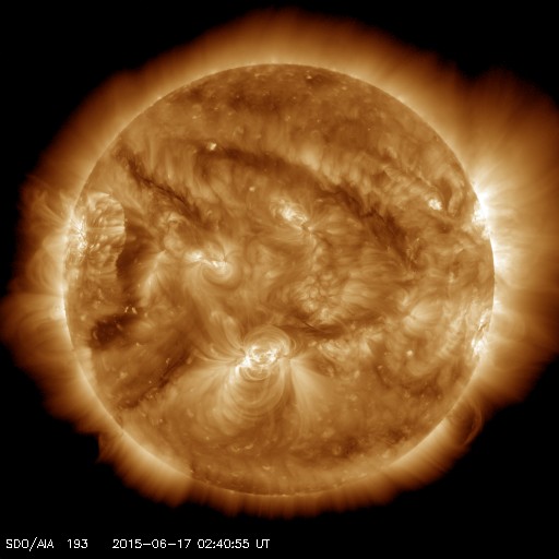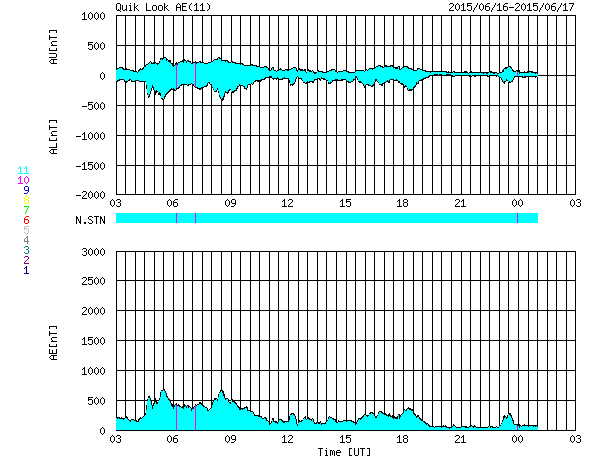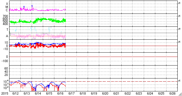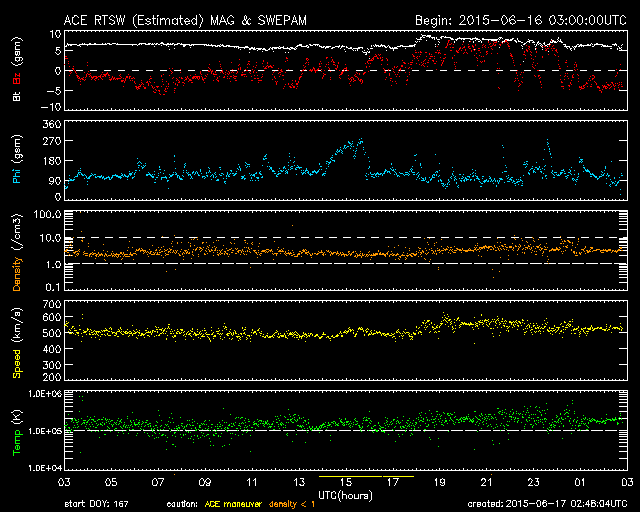 2015/ 6/17 11:48 更新 太陽風は500km/秒台の高速状態が続いています。 担当 篠原 高速の太陽風が続いています。 今日に入った頃、太陽風の速度は再び550mk/秒に上がり、 現在も520km/秒と高い状態が続いています。 磁場強度も、7nTから9nTに一旦上がって、 現在は7nTに戻っています。 磁場の南北成分は、グラフの前半は南寄り、 後半は北寄りとなっています。 このため、AE指数のグラフも、 前半は500nT程度の中規模の変化が起きていますが、 後半はやや静かになっています。 ACE衛星の図を見ると、最後のところで、 磁場は再び南寄りに切り替わっているようです。 すると、磁気圏の活動もこれから再び高まりそうです。 太陽の東端から現れた黒点は、2371黒点群と番号が付きました。 SDO衛星による拡大写真を掲載します。 SDO衛星AIA193の動画を見ると、 昨日同様に小さい活動が活発に起きていて、にぎやかです。 Cクラス以上では、C1.3、C1.9、C1.7、C3.2と起きていて、 今後も注目して下さい。 放射線帯の高エネルギー電子は、昨日と同じ程度を保っています。 高速の太陽風が続いているので、 もう一段増加するかもしれません。