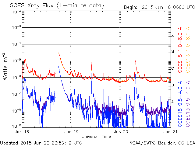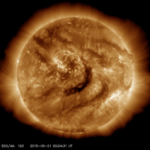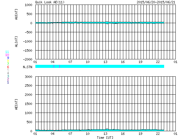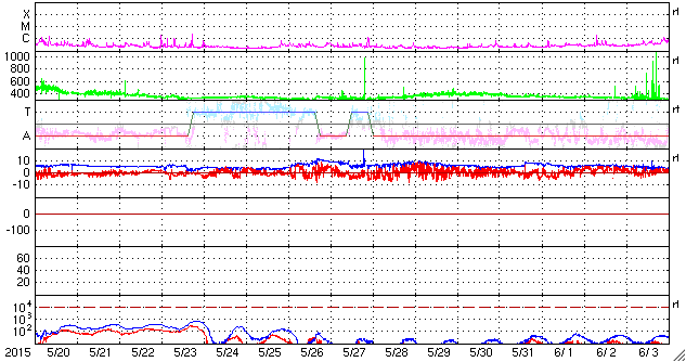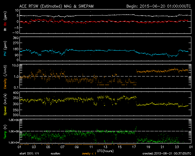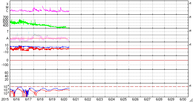 2015/ 6/21 09:37 更新 M1.0のフレアが発生しています。太陽風は更に低速になっています。 担当 篠原 2371黒点群は、20日15時半(世界時20日6時半)に、 M1.0の中規模フレアを起こしました。 目立った活動はこの程度ですが、SDO衛星の動画を見ると、 2371群では、小さい変動が活発に起きています。 黒点の規模も大きく、 引き続き、フレアの発生に注目して下さい。 太陽風は、340〜350km/秒と低速でしたが、 今日の未明に、300km/秒と更に遅い風に変わりました。 現在は、280km/秒へ下がっていて、かなり遅い状態です。 一方、磁場強度は、5nTと平均的な状態で安定しています。 磁場の南北成分は、0nT付近で安定しています。 速度がとても遅くなっていることもあり、 磁気圏はとても穏やかで、 AE指数のグラフは全く変化していません。 明日、22日くらいから、 2つのCMEによる太陽風の乱れが到来する可能性があります。 速度の変動はあまり大きくならない様に思いますが、 強い磁場が運ばれてきて、南向きに強まると、 磁気圏の活動が激しくなる可能性があります。 また、SDO衛星AIA193の太陽の中心付近に見える コロナホールの影響も、 23日以降にやって来る可能性があります。 全体としてどのような変動になるのか、注目してください。