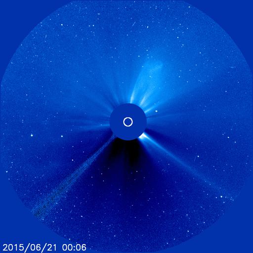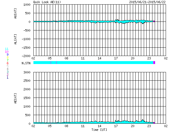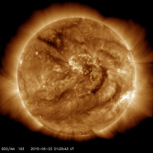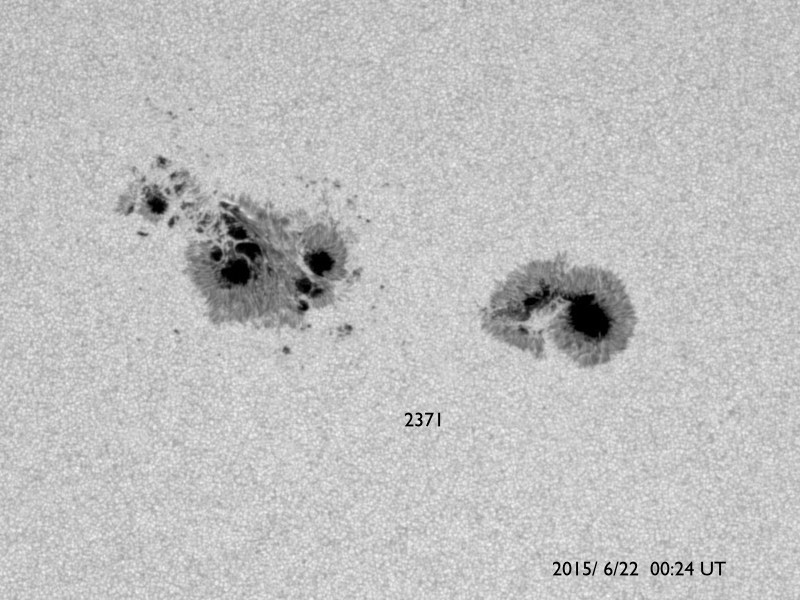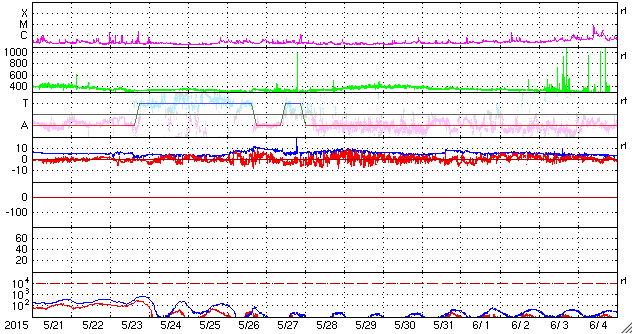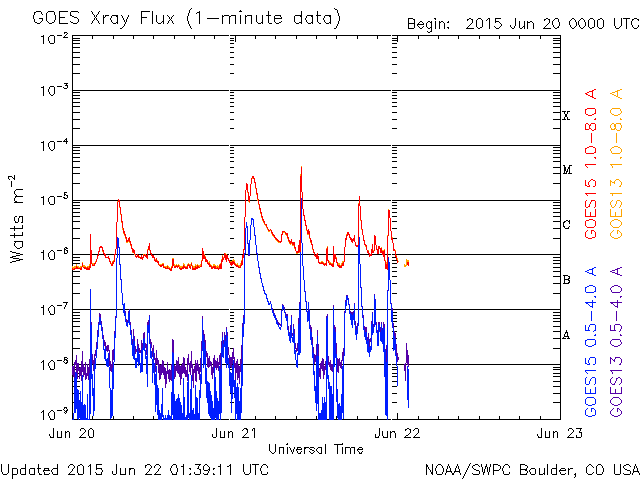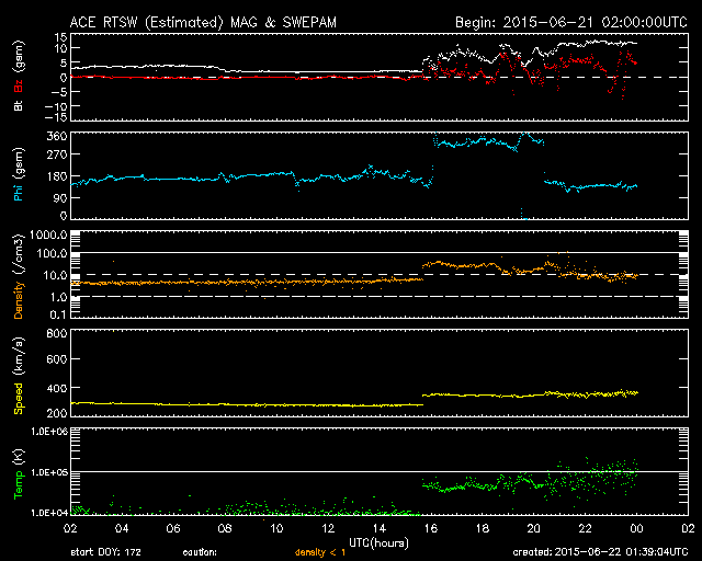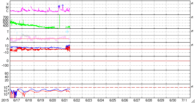 2015/ 6/22 10:39 更新 Mクラスフレアが4回発生しました。地球方向にCMEも飛び出しています。 担当 篠原 昨日のニュースの直後、 21日10時と11時(世界時21日1時と2時)に、 太陽の中央の2371黒点群で、 M2.0とM2.6の2つの中規模フレアが発生しました。 SDO衛星AIA193と131による動画を掲載します。 変化が速くて、1つのフレアの様に見えますが、 強く輝く瞬間が2回起きています。 X線グラフを見ると、変化が長時間続くタイプのフレアで、 CME(太陽ガスの放出現象)も発生しています。 太陽の中心付近で発生したため、 SOHO衛星LASCO C3の動画では、 CMEの白いガスが、太陽を丸く包む様に広がっています。 見事なハロー型のCMEで、 噴出したガスは地球へ向かって飛び出しています。 地球まで2〜3日くらいと考えると、 23日の後半から24日にかけて太陽風の乱れが到来しそうです。 その前の太陽風の乱れと重なって、 しばらく分かりにくい変化になるかもしれません。 2371群に続いて、南西(右下)の2367群の活動も高まり、 21日18時半(世界時21日9時半)にM3.8、 22日3時(世界時21日18時)にM1.1と、 2つの中規模フレアを起こしています。 2367群はもうすぐ西に沈みますが、 2371群は太陽の中心線にちょうど達したところです。 引き続き活動に注目して下さい。 今日は、太陽風の擾乱も到来しています。 22日0時半(世界時21日15時半)に、 太陽風の速度が、280km/秒から350km/秒に上がり、 磁場強度も、2nTから10nTへ強まっています。 CMEによる乱れが到来したと考えられます。 速度の変化は小さく、現在も360km/秒と低速の状態です。 磁場は強まっていますが、 南北成分は、北寄りに振れていて、 磁気圏への影響は今のところ小さいものに留まっています。 AE指数のグラフは、とても小さい変化が見られる程度です。 この後、次のCME、コロナホール、 そして、昨日のCMEと、 いろんな擾乱が重なる様にやって来そうです。 現在は、太陽風の磁場が北寄りに変化しているので、 磁気圏は静穏ですが、 今後、磁場が反転して、南寄りに強まる様になると、 磁気圏の活動も高まっていきます。 明日、明後日と、太陽風、磁気圏の変動に注目して下さい。