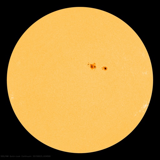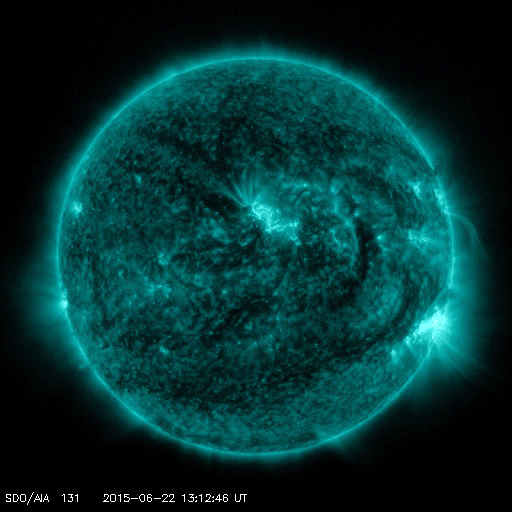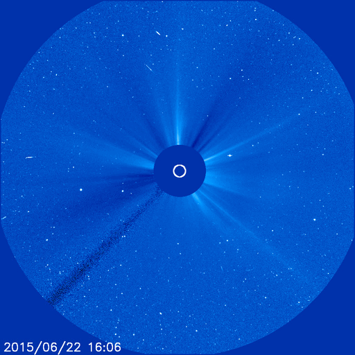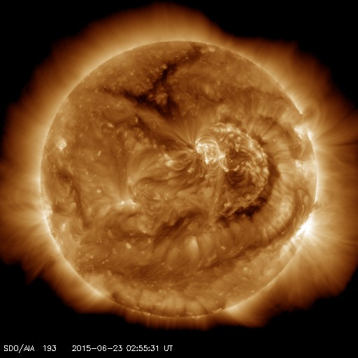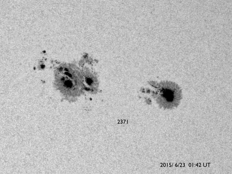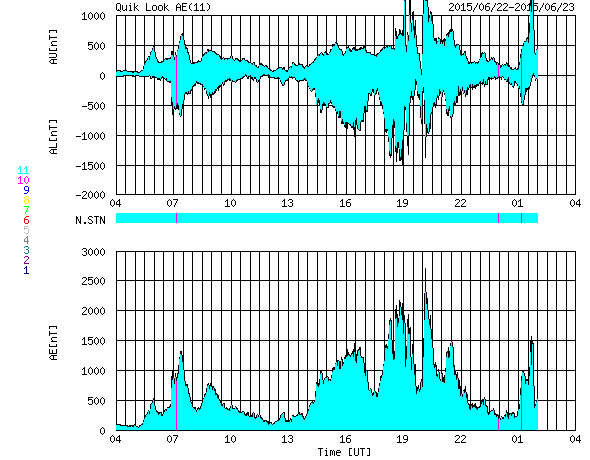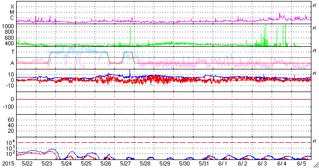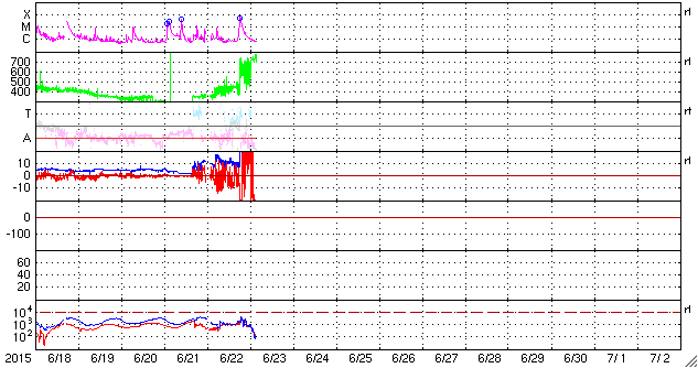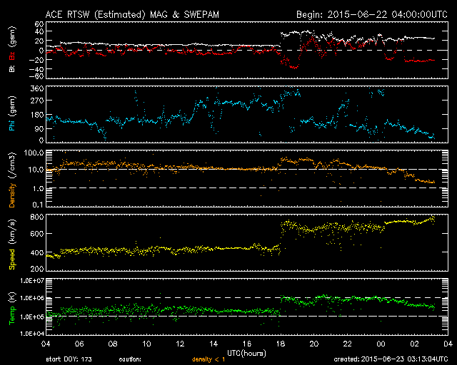 2015/ 6/23 12:12 更新 太陽風の乱れが到来して、速度700km/秒、磁場強度40nTに強まりました。また、M6.5のフレアが発生しています。 担当 篠原 今日未明、23日3時(世界時22日18時)に、 太陽風の乱れが到来して、 速度は、400km/秒から700km/秒に、 磁場強度は、10nTから40nTに、 急に強まる変化が発生しています。 昨日紹介した、M2.0、M2.6フレアに伴うCMEの乱れが、 発生から1日半で地球まで到達した様です。 太陽風の磁場は、初めに大きく南向きに振れて、 -40nTの変化に達しています。 速度も高まっていたため、磁気圏への影響は大きく、 AE指数は、瞬間的に2500nTを超える、 たいへん激しい変化を記録しています。 また、京都大学WDCによるDst指数の速報値は、 -144nTまで下がっていて、大きな磁気嵐も発生しています。 擾乱の到来から8時間ほど経過しましたが、 現在も、太陽風の速度は700km/秒とたいへん高く、 磁場強度も25nTと大きく強まった状態です。 また、磁場の南北成分は、 -20nTという強い南向きが3時間ほど続いています。 このため、磁気圏の激しい乱れは、現在も続いていると考えられます。 今後のAE指数、Dst指数の変化に注目して下さい。 一方、23日2時半(世界時22日17時半)には、 太陽の中央の2371黒点群で、 M6.5とやや大きい中規模フレアが発生しています。 SDO衛星AIA131による動画を掲載します。 この規模のフレアの発生は、5月5日のX2.7以来です。 フレアに伴って、CMEも発生しています。 SOHO衛星LASCO C3の動画を見ると、 昨日と同じように、太陽全体を包む様に白いガスが広がっています。 このため、地球へも太陽風の乱れが到来すると予想されます。 2日程度で地球まで達すると考えると、 24日後半から25日くらいになりそうです。 動画の様子では、昨日のCMEよりも少し淡い様に見えますが、 どの様な擾乱がやって来るのか、今後の太陽風データに注目して下さい。 ![]() Dst指数(速報値)は、-144nTまで下がっています。Dst指数の変化はマイナス方向に強まります。 (c) 京都大学WDC ![]() 2371黒点群で発生したM3.0の中規模フレア。SDO衛星AIA131。 (c) SDO (NASA)、 (写真加工 : 宇宙天気ニュース) ![]() M3.0フレアに伴って発生したCME。SOHO衛星LASCO C2、C3。 (c) SOHO (ESA & NASA) ![]() 2371黒点群の拡大写真。SDO衛星。 (c) SDO (NASA)、 (写真加工 : 宇宙天気ニュース) ![]() SDO衛星のAIA193カメラによる太陽コロナの様子 (c) SDO (NASA) ![]() SDO衛星による太陽の可視光写真。マウスの矢印を写真に重ねると、黒点番号付きの写真に切り替わります。 (c) SDO (NASA) ![]() ACEが観測した太陽風の磁場(1番上の枠、白線は全体の強度、赤線は南北成分) および、太陽風の密度(3番目の橙線)、速度(4番目の黄線) (c) NOAA/SWPC ![]() リアルタイムAE指数 下段のAEグラフの値が高くなると、オーロラ活動が活発化しています。 (c) 京都大学, NICT ![]() 27日の太陽周期に合わせたデータプロット 太陽が同じ面を地球に向けていた27日前の変化から、今後を予想することができます。 (c) 作図:宇宙天気ニュース