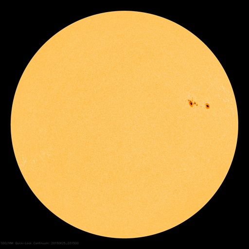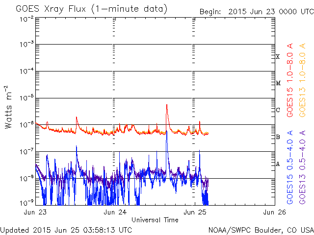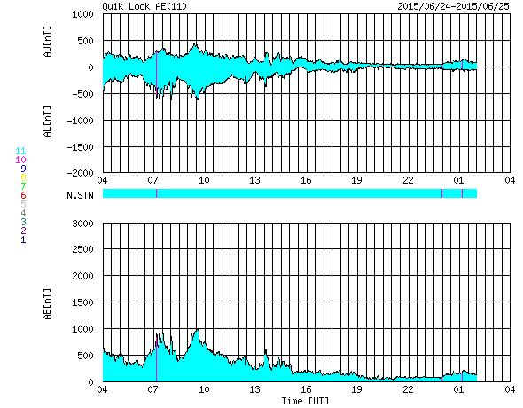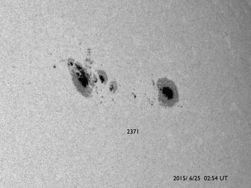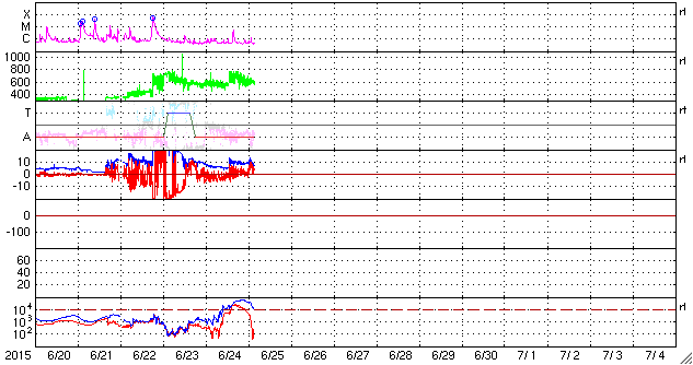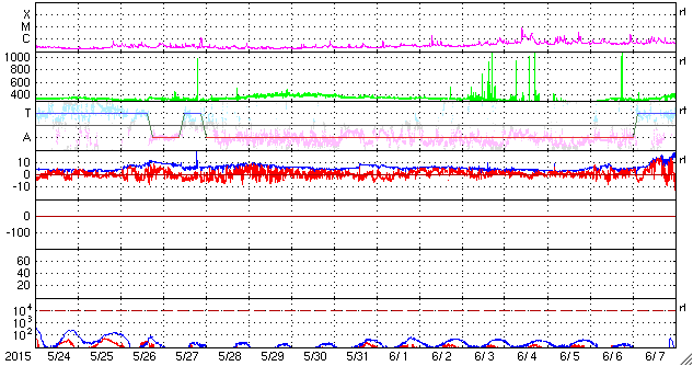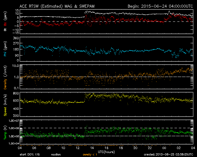 2015/ 6/25 12:59 更新 次の太陽風の乱れが到来しました。磁場は北寄りになり、磁気圏の乱れは強まりませんでした。 担当 篠原 M6.5のフレアによる太陽風の乱れは、 昨夜、24日22時(世界時24日13時)にやって来ました。 太陽風の速度は、600km/秒から700〜750km/秒に高まり、 磁場強度も、5nTから10nTを越える程度に強まっています。 速度の高まりは、前の乱れと同じくらいですが、 磁場強度の変化は、40nTまで強まった前回と比べると、 今回は並の変化と言えそうです。 しかも、磁場の南北成分は、北寄りに推移しています。 このため、磁気圏の活動は特に高まらず、 AE指数は、むしろこの擾乱到来後は静かになっています。 磁気嵐を示すDst指数も、更に変化が弱まって、 平常値(0nT付近)に戻りかけています。 現在の太陽風速度は、少し下がって600km/秒です。 磁場強度も7nTと平均的な値に戻りつつあり、 太陽風の乱れは、ゆっくりと終わりに向かっている様です。 2371黒点群の活動も、弱まりつつある様です。 25日0時(世界時24日15時)に、 C5.6の小規模フレアを起こしましたが、 この他は、C1の小さいフレアを数回起こした程度です。 SDO衛星による黒点の拡大写真を掲載しますが、 これまでの迫力はなくなっています。 一方、太陽面には、この他に黒点の姿はなく、 東端も穏やかなので、 2371群の活動の弱まりとともに、太陽も穏やかになりそうです。 太陽風擾乱の影響を受けて、 放射線帯の高エネルギー電子が大きく増加しています。 GOES15(青線)は、10,000を大きく超えて、 50,000に達している様です。