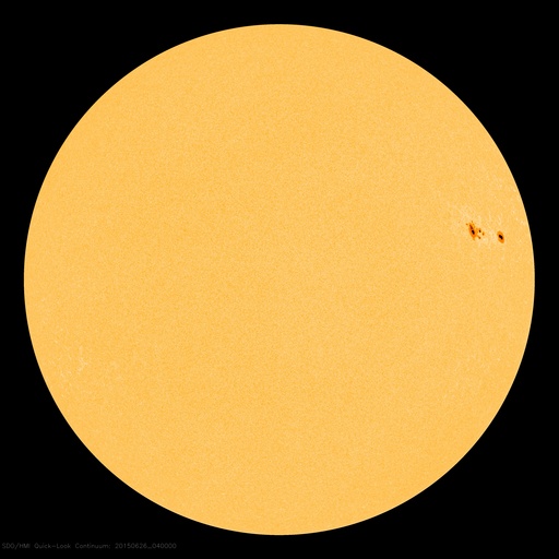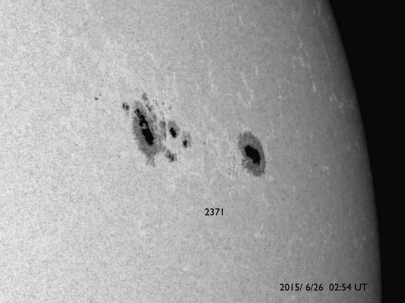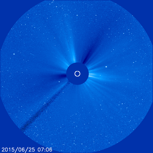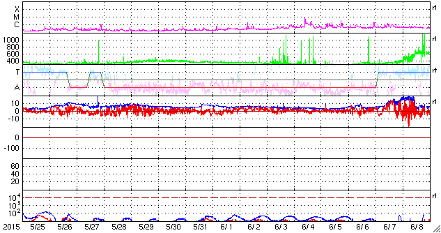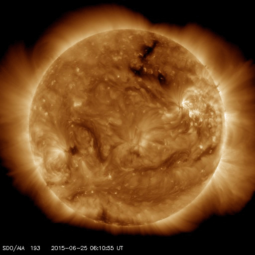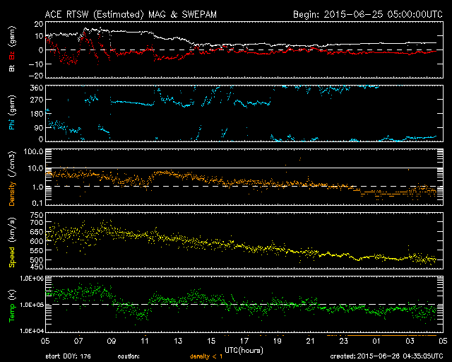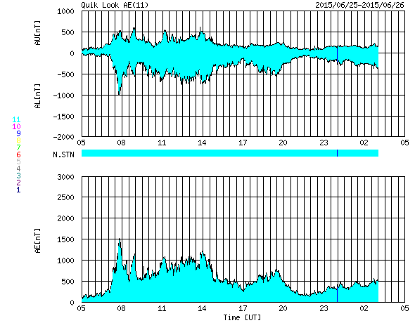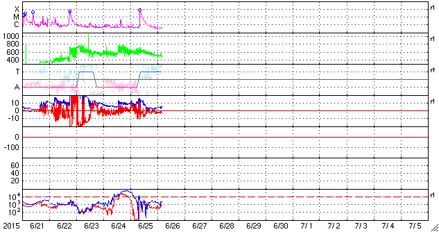 2015/ 6/26 13:35 更新 M7.9の中規模フレアが発生しました。太陽風の乱れは地球にも到来しそうです。 担当 篠原 2371黒点群で、再び大きいMクラスフレアが発生しました。 昨夕、25日17時(世界時25日8時)のM7.9です。 SDO衛星AIA193による動画を掲載します。 フレアの後に、プロミネンスのループがとてもきれいに輝いています。 このフレアに伴って、CME(太陽ガスの放出現象)も飛び出していて、 SOHO衛星LASCO C3では、 太陽の右側を中心に、コロナのガスが広がっています。 CMEは、太陽の左側も包む様に広がっています。 このため、太陽風の乱れは地球の方向にもやって来ると思われます。 発生から2日程度と考えると、 明日、27日夕方から明後日にかけて到着しそうです。 NOAA/SWPCの太陽風予報では、 28日0時(世界時27日15時)頃となっています。 太陽風の速度の高まりとともに、強い磁場が運ばれてきて、 南向きに大きく振れるなどすると、 磁気圏の活動が再び激しくなる可能性があります。 2371黒点群は、その後は目立ったフレアを起こしていません。 昨日も似た様な状況でしたので、 黒点群が西の端に没するまで見届ける必要がありそうです。 600km/秒だった太陽風は、昨夜遅くから速度が下がり始め、 現在は500km/秒と普通の高速太陽風程度に戻っています。 磁場強度は、昨日のニュースの後に再び10nTに強まりましたが、 今日に入ってからは、5nTと平均的な値に下がっています。 磁場の南北成分は、掲載のグラフではやや見にくいですが、 南寄りに推移した時間帯があり、 速度が高まっているため磁気圏の活動もより強まって、 AE指数は、1000nT前後の変化が半日近く続いています。 現在も磁場は弱い南向きになっていて、 AE指数は500nT前後の変化が続いています。 太陽風の強まりは、一旦終わりに向かいそうですが、 すぐに次の擾乱が始まりそうです。