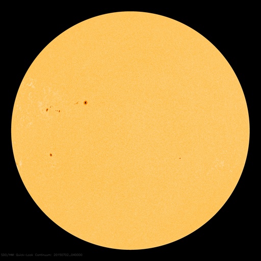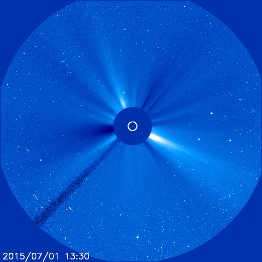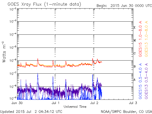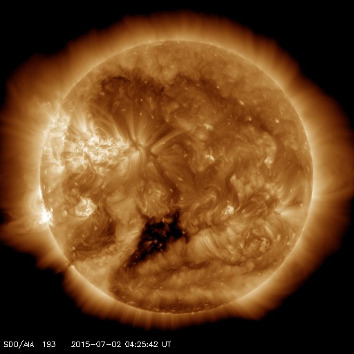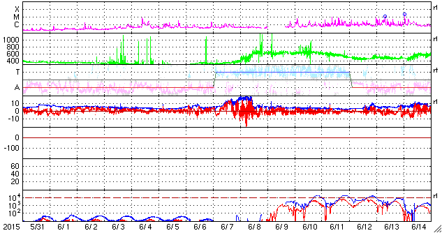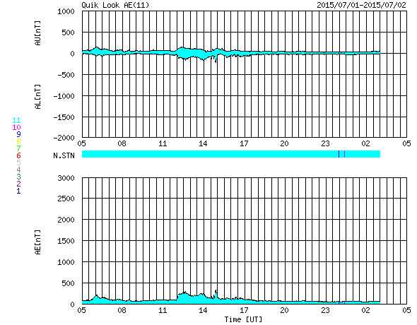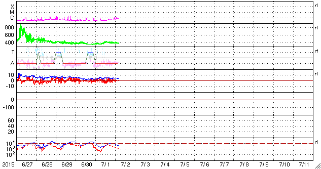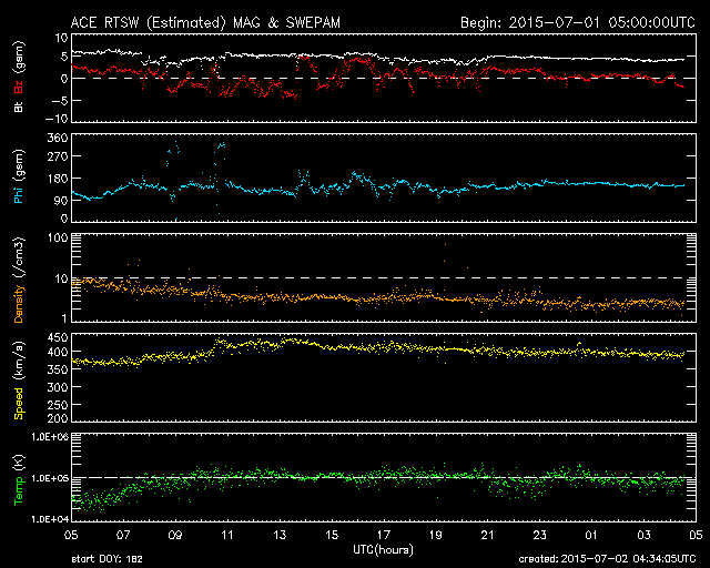 2015/ 7/ 2 13:32 更新 太陽風は平均的な速さです。磁気圏は穏やかです。 担当 篠原 太陽風の速度は、400km/秒前後と平均的な速さに戻っています。 磁場強度は、5nT付近で安定しています。 速度が少し上がる変化をしていますが、 全体としては太陽風は穏やかです。 磁場の南北成分は、小さい振幅で変化しています。 磁気圏は穏やかで、AE指数のグラフは中央に小さい山がある程度です。 SDO衛星AIA193の太陽写真では、 南半球のコロナホールの先頭(右端)が、太陽の中心線に達しています。 これから3〜4日程経つと、太陽風が強まる可能性があります。 27日周期の図で前周期を参照すると、5日頃の到来になりそうです。 太陽は穏やかで、 2376黒点群でC1の小さいフレアが2回起きた程度です。 SOHO衛星LASCO C3では、CMEの噴出が見られますが、 太陽の向こう側の現象で、地球への影響はありません。 放射線帯の高エネルギー電子は、 10,000を割る程度に下がっています。