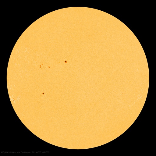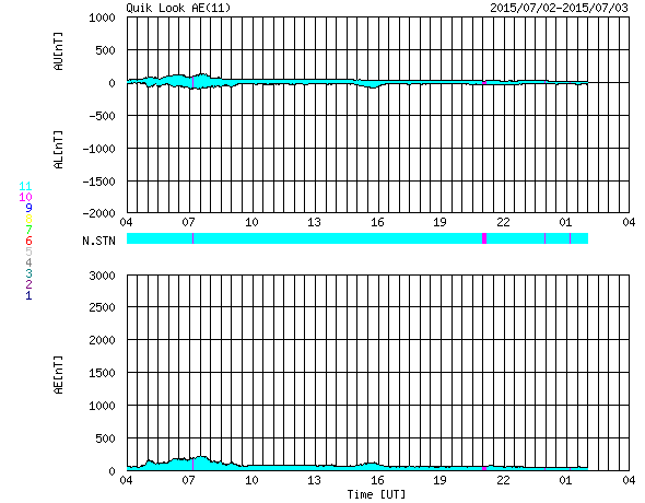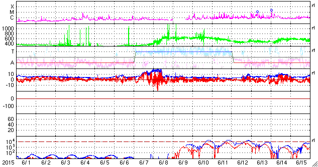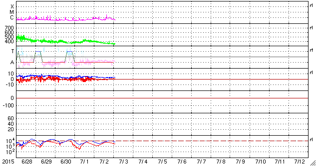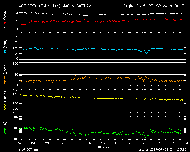2015/ 7/ 3 12:41 更新 太陽風は低速になり、磁気圏は穏やかです。太陽でC5の小規模フレアが起きています。 担当 篠原 太陽風の速度は、400km/秒から340km/秒へ下がり、 低速風に変わっています。 磁場強度は、3〜4nTとやや弱くなっています。 磁場の南北成分は、0nT付近で小さく変化する程度です。 太陽風の速度が下がっていることもあり、磁気圏は静穏で、 AE指数は小さい変化が部分的に起きている程度です。 SDO衛星AIA193の太陽写真では、 南半球のコロナホールは太陽の中心に見えていて、 地球の方向に速度の高い太陽風を吹き出しています。 およそ3日ほどで地球に達するので、 7月6日頃の太陽風は、既に高速風に変わっていそうです。 太陽は、西側(右側)の新しい黒点に2377群、 東端(左端)の黒点に2378群と番号が付けられています。 北東側(左上)の2373群と2376群がやや活動的で、 C1の小さいフレアを数回と、C3.7の小規模フレアを起こしています。 また、ちょうどニュースを書いている3日12時(世界時3日3時)に、 2378群でC5.6とやや大きいCクラスのフレアが発生しています。 ![]() SDO衛星のAIA193カメラによる太陽コロナの様子 (c) SDO (NASA) ![]() SDO衛星による太陽の可視光写真。マウスの矢印を写真に重ねると、黒点番号付きの写真に切り替わります。 (c) SDO (NASA) ![]() ACEが観測した太陽風の磁場(1番上の枠、白線は全体の強度、赤線は南北成分) および、太陽風の密度(3番目の橙線)、速度(4番目の黄線) (c) NOAA/SWPC ![]() リアルタイムAE指数 下段のAEグラフの値が高くなると、オーロラ活動が活発化しています。 (c) 京都大学, NICT ![]() 27日の太陽周期に合わせたデータプロット 太陽が同じ面を地球に向けていた27日前の変化から、今後を予想することができます。 (c) 作図:宇宙天気ニュース