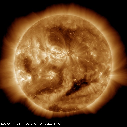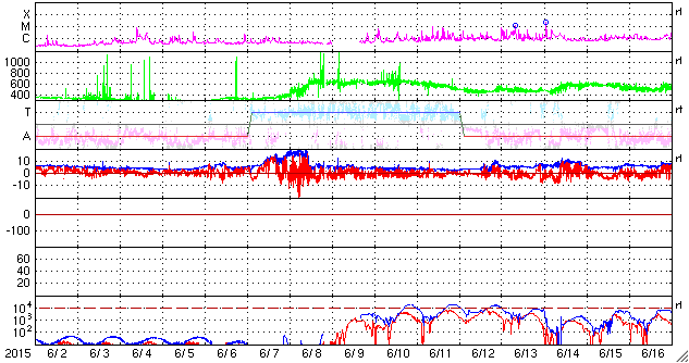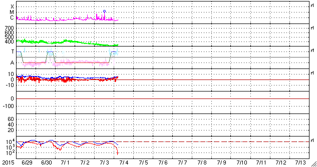 2015/ 7/ 4 14:38 更新 太陽風は更に低速になっています。M1.5のフレアが発生しました。 2015/ 7/ 4 14:43 追加 図を追加します。 担当 篠原 太陽風の速度は、320km/秒へ下がり、 更に低速の風になっています。 磁場強度は、3nTから5nTに少し上がっていますが、 平均的な値です。 磁場の南北成分は、北寄りに推移しています。 太陽風の速度が下がっていることもあって、 磁気圏は穏やかです。 AE指数にはほとんど変化が見られません。 27日周期の図を見ると、太陽風磁場のセクターの切り替わりが、 前周期と同様に起きています。 前周期のグラフを参考にすると、 これから磁場強度が次第に高まり、 明日くらいから高速太陽風が始まる可能性があります。 SDO衛星AIA193の写真では、発生源のコロナホールは、 だいぶ西側に進んでいます。 太陽は、東端の2378黒点群で、C1〜3の小規模フレアが続き、 昨夜、3日22時(世界時3日13時)には、 M1.5の中規模フレアが発生しています。 2015/ 7/ 4 14:43 追加 (篠原) 関連の図はページの最後にあります 図が入らない状態で記事が更新されてしまいましたので、 図のみ追加で掲載します。 ![]() 2015/ 7/ 4 14:43 追加 SDO衛星のAIA193カメラによる太陽コロナの様子 (c) SDO (NASA) ![]() SDO衛星による太陽の可視光写真 (c) SDO (NASA) ![]() ACEが観測した太陽風の磁場(1番上の枠、白線は全体の強度、赤線は南北成分) および、太陽風の密度(3番目の橙線)、速度(4番目の黄線) (c) NOAA/SWPC ![]() リアルタイムAE指数 下段のAEグラフの値が高くなると、オーロラ活動が活発化しています。 (c) 京都大学, NICT ![]() 27日の太陽周期に合わせたデータプロット 太陽が同じ面を地球に向けていた27日前の変化から、今後を予想することができます。 (c) 作図:宇宙天気ニュース