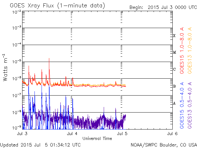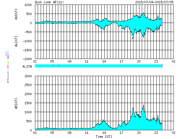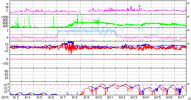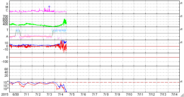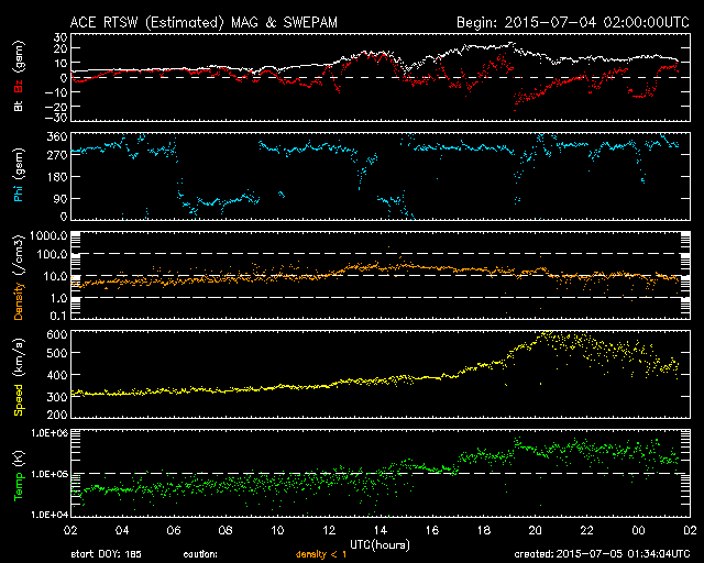 2015/ 7/ 5 10:32 更新 高速の太陽風が到来して、速度は600km/秒近くまで高まりました。 担当 篠原 コロナホールによる太陽風の乱れが到来して、 磁気圏の活動を活発にしています。 昨夜から太陽風の磁場強度が強まって、 10〜20nTに達するようになりました。 速度も、初めはゆっくりと上がっていましたが、 5日2時(世界時5日17時)に、 400km/秒を越えた頃から上昇が早まり、 5日5時(世界時5日20時)には、 550〜600km/秒の高速状態に達しました。 しかし、速度はすぐに下がり始めて、 5時間ほど経った現在は、 450km/秒とやや高速程度に戻っています。 磁場の南北成分は、+10nTから -10nTにかけて、 大きい幅で変化しています。 このため、磁気圏の活動も高まっていて、 AE指数は、1400nTに達する大きな変化も発生しています。 現在は、速度、磁場強度ともに少し下がっているので、 磁気圏の変動も規模は弱まりそうです。 27日周期の図によると、 前周期と比べて高速風の到来は半日ほど早まっています。 前周期は、600km/秒台に達する高速状態が、3日程度続きましたが、 今回はどうなるでしょうか。 再び速度が高まるのか、今回はこの程度で推移するのか。 磁場強度は10nTに強まったままなので、 引き続き今後の変化に注目して下さい。 太陽は、昨日のニュース以降目立った活動はなく、 X線のグラフも急に静かになっています。 黒点は、あちこちににぎやかに見えているのですが、 活動が落ち着いたのか、一休みなのか、 この後どうなるでしょうか。