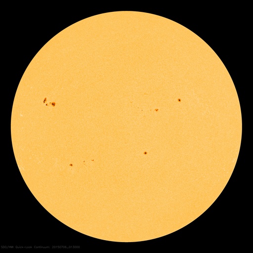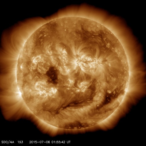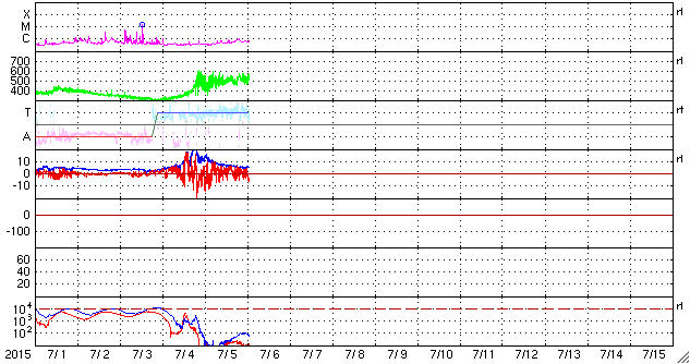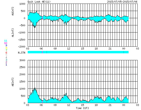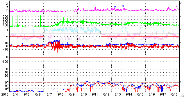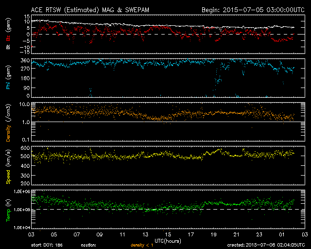 2015/ 7/ 6 11:05 更新 500km/秒の高速太陽風が続いています。磁気圏もある程度活動的です。 担当 篠原 太陽風の速度は、再び500km/秒に上がり、 現在まで安定して続いています。 一方、磁場強度は、10nTから5nTへ下がり、 平均的な値に戻っています。 前周期と同様に、高速太陽風はこの辺りで中盤を迎えている様です。 ただし、前周期は600km/秒の高い速度が続いたのに対し、 今回は、500km/秒程度に留まっています。 太陽風磁場の南北成分は、北向きになる時間が多いですが、 頻繁に南にも変化しています。 このためか、AE指数も比較的変化が目立っていて、 500nT前後の変化がグラフ全体に続いています。 27日周期の図の前周期の太陽風を見ると、 6月12日以降も500km/秒と高い速度は続き、 14日に再び速度が高まっています。 この高速風をもたらしたコロナホールは、 今日のSDO衛星AIA193の太陽写真の中央部左側に見えています。 このため、今回も同様の推移となるかもしれません。 前周期の様子と比較しながら、ACEのデータに注目して下さい。 太陽は、目立ったフレアの発生はありませんが、 北東(左上)の2381黒点群の発達が目立っています。 小さい活動も強まっている様なので、 今後、フレアの発生などにつながる可能性があります。