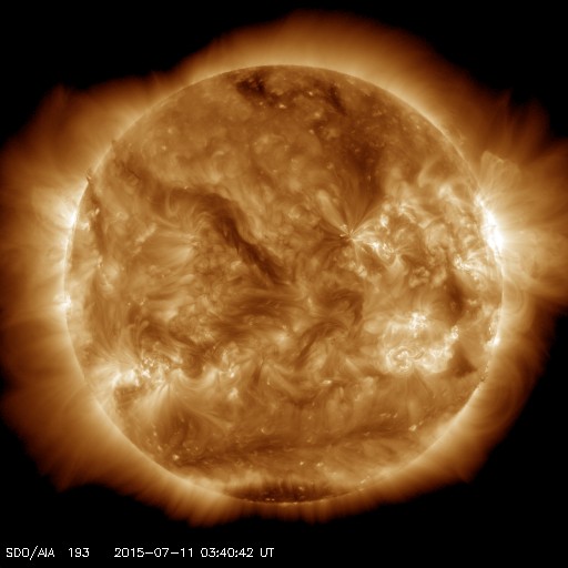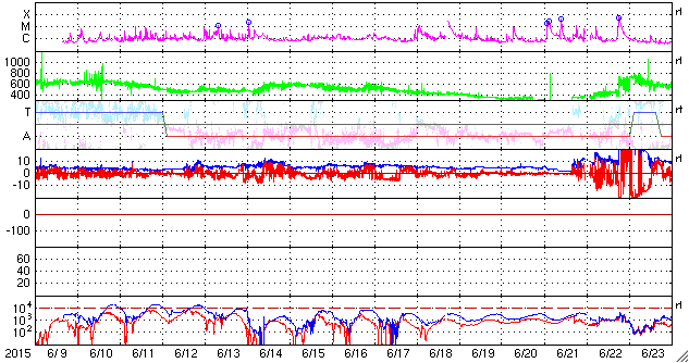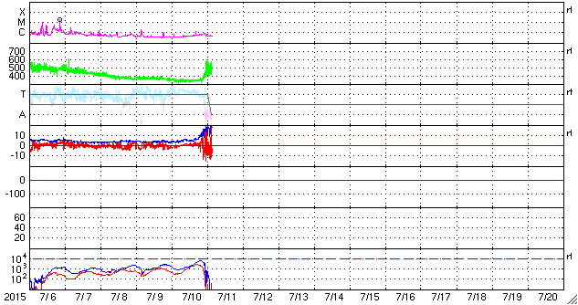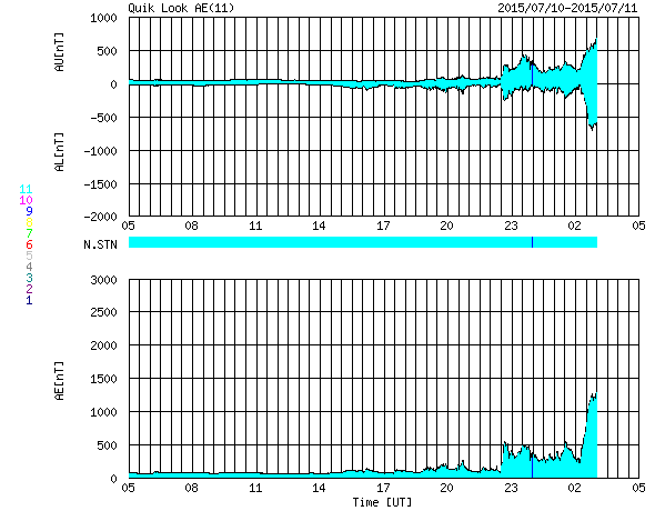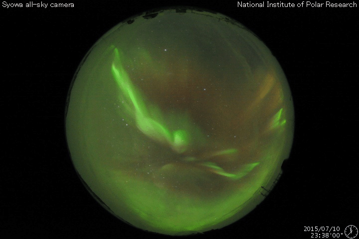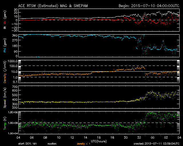 2015/ 7/11 13:00 更新 太陽風の速度は500km/秒台に高まり、磁気圏の活動もやや強まっています。 2015/ 7/11 13:08 追加 AE指数は1200nTと大きく変化しています。 担当 篠原 太陽風の強まりが始まりました。 11日3時(世界時10日18時)頃から、 太陽風の磁場強度が、5nTから10nTへ強まりました。 続いて、11日6時(世界時10日21時)頃から速度も上昇を始め、 350km/秒の低速状態から、500〜550km/秒の高速風に変わっています。 速度が上がった頃には、磁場強度も更に強まっていて、 現在は、15〜20nTで推移しています。 27日周期の図を見ると 高速風の始まりは、前周期と同じようなタイミングでした。 磁場の南北成分は、南と北に大きく振れていて、 -10nTと強い南向きも発生しています。 AE指数も変化が始まっていますが、 今のところ、500nT程度とそれほど強まっていません。 それでも、南極の昭和基地では活発なオーロラが観測されています。 AE指数が強まり始めた頃の全天カメラによる動画を掲載します。 27日前の前周期は、これから4日ほど高速風が続きました。 今回はどうなるでしょうか。 太陽は、C1.1の小さいフレアが1回起きた程度で、 穏やかです。 2015/ 7/11 13:08 追加 (篠原) 関連の図はページの最後にあります 記事を書いていた間に、AE指数のグラフが更新されていて、 掲載した図には、1200nTの大きい変化が記録されていました。 高速太陽風の影響で、磁気圏の活動は高まっているようです。