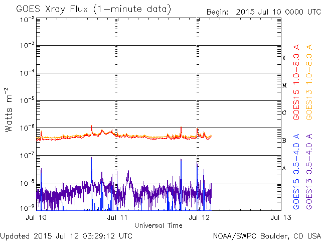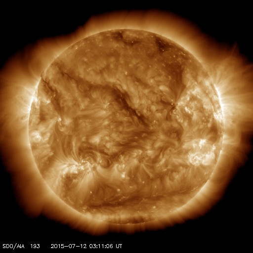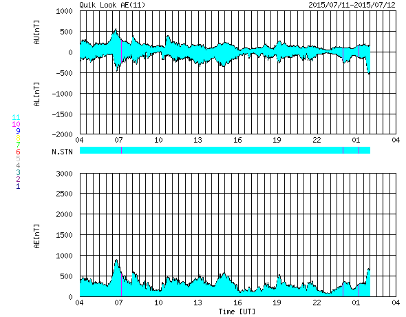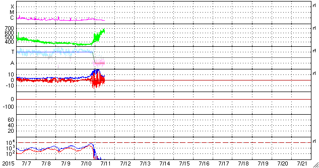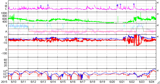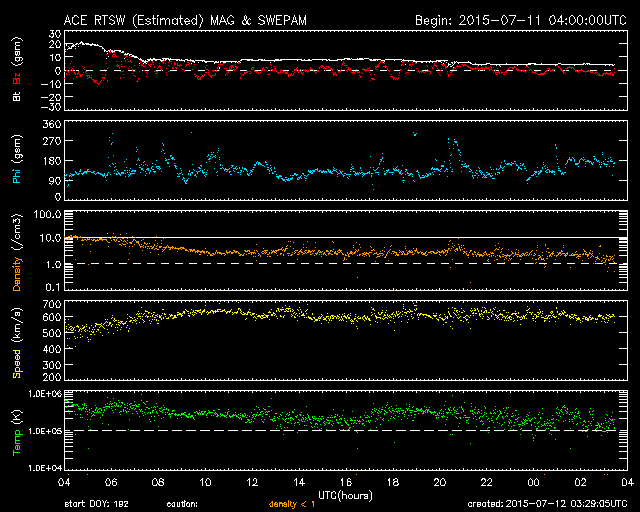 2015/ 7/12 12:30 更新 太陽風は600km/秒の高速風に高まっています。 担当 篠原 太陽風の速度は、更に高まって、600km/秒に達しています。 27日前の前周期の高速風と同じ程度に高まりました。 一方、太陽風の磁場強度は、 4nTと平均的な強さに下がっています。 磁場の南北成分は、0nT付近で小さく南北に変化しています。 速度が高まっていることもあり、 磁気圏では中小規模の活動が続いていて、 AE指数は、300〜700nTと、 激しいというほどではありませんが、頻繁に変化しています。 磁場強度が下がってきたので、 高速太陽風は最高速度に達していると思われます。 前周期は、この後に2〜3日程度高速状態が続いたので、 今回も同じような変化になるかもしれません。 太陽は、目立った活動はなく、穏やかです。 今日は、ネットワークに障害が発生している様で、 データの取得ができません(この記事も半手動で更新しています)。 このため、情報BOXやグラフの作成ができなくなっています。 たいへん申し訳ありません。