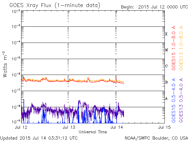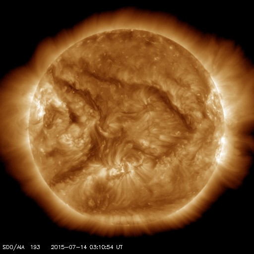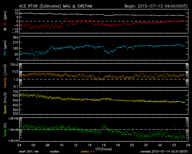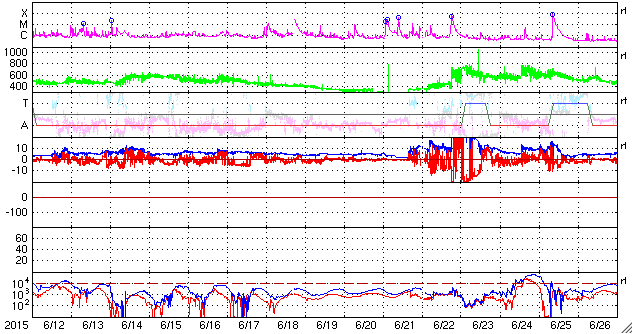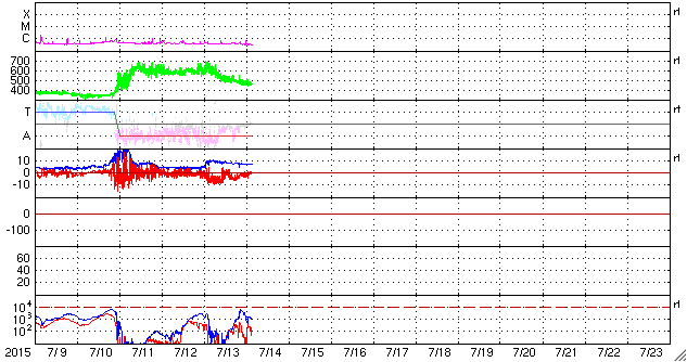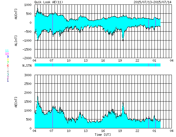 2015/ 7/14 12:31 更新 太陽風の強まりにより、磁気圏の活動も高まりました。高速風は終わっています。 担当 篠原 650km/秒に高まっていた太陽風の速度は、 昨日のニュースの頃がピークだった様で、 その後はゆっくりと低下して、 現在は460km/秒と平均的な状態に戻りつつあります。 27日周期の図を見ると、今回の高速風は3日ほど続き、 前周期より1日ほど短くなってた様です。 太陽風の磁場強度も、10nTから7nTに下がっていますが、 まだ少し強まった状態です。 南北成分は、今日の未明くらいまでは、 -5nT前後と南向きに振れていました。 速度が高まっていることと重なって、 磁気圏の活動はかなり活発になり、 AE指数は、1000nT前後の激しい活動が続き、 1500nTに達する変化も発生しています。 この2つめの1500nT近い変動の頃の、 昭和基地の様子を動画で紹介します。 空全体を覆う様にオーロラの輝きが押し寄せてきます。 今朝以降、磁場の南北成分は0nT付近に下がっています。 太陽風の速度も下がっているため、 磁気圏の変化は小さくなっていくでしょう。 太陽は、フレアの発生はなく、穏やかです。 黒点の様子も、変化はありません。 放射線帯の高エネルギー電子は、やや増加しましたが、 10,000に達するほどの変化にはなっていません。 ![]() 南極の昭和基地で、世界時13日19時半に観測されたオーロラ。 (c) 国立極地研究所、(動画加工 : 宇宙天気ニュース) ![]() SDO衛星のAIA193カメラによる太陽コロナの様子 (c) SDO (NASA) ![]() SDO衛星による太陽の可視光写真。マウスの矢印を写真に重ねると、黒点番号付きの写真に切り替わります。 (c) SDO (NASA) ![]() ACEが観測した太陽風の磁場(1番上の枠、白線は全体の強度、赤線は南北成分) および、太陽風の密度(3番目の橙線)、速度(4番目の黄線) (c) NOAA/SWPC ![]() リアルタイムAE指数 下段のAEグラフの値が高くなると、オーロラ活動が活発化しています。 (c) 京都大学, NICT ![]() 27日の太陽周期に合わせたデータプロット 太陽が同じ面を地球に向けていた27日前の変化から、今後を予想することができます。 (c) 作図:宇宙天気ニュース