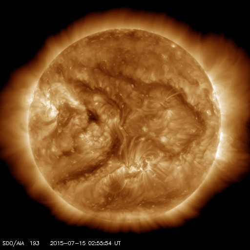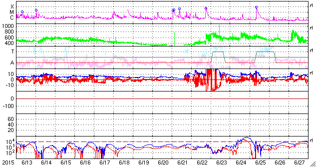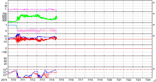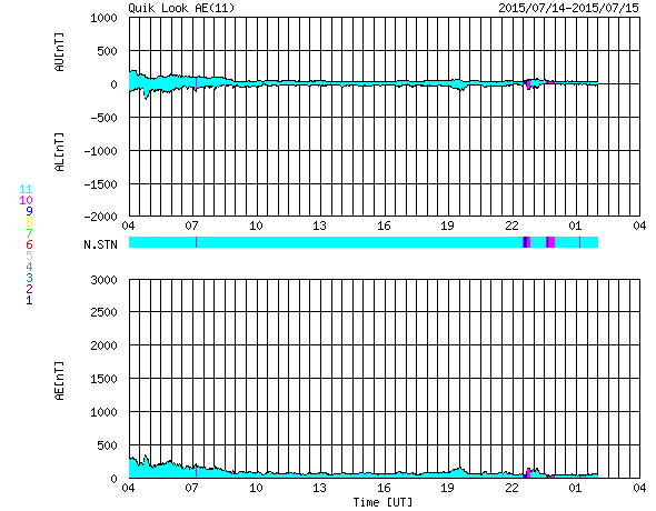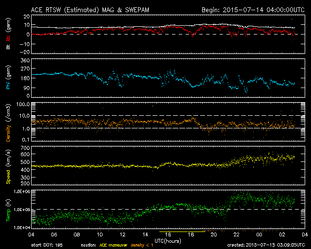 2015/ 7/15 12:09 更新 太陽風は再び高速風に戻っています。ニュージーランドのオーロラをどうぞ。 担当 篠原 ニュージーランド南島ダニーデンの中村太一さんより、 今回の太陽風擾乱によるオーロラの写真をいただきました。 1枚目は、最初の強まりによる、現地11日18時半(世界時6時半)の撮影です。 太陽風の速度が550km/秒に上がり、磁場は20nTに強まっていた頃です。 町から離れた、空の条件の良い場所での撮影とのことで、 暗い空の中にオーロラの光が低く見えています。 2枚目以降は、第二波と言える、13日の太陽風の強まりによるオーロラです。 町に近い場所での撮影のため、空がやや明るく、 街灯の光も映っているそうです。 こちらの時間の方が、AE指数の変化は大きく、 磁気圏の乱れはより強まっていました。 オーロラの見え方も、より迫力を感じます。 4枚目は、流星と南十字と一緒に写っています。 見事な組み合わせですね。 ニュージーランドは、南極から北上する強い低気圧の影響で、 雲が多く、風も強くなり、凍結することも多くなっているそうです。 条件は厳しいですが、その代わり空気もきれいで、 より暗い空で観測できる季節だとのことです。 記事では、昭和基地の全天カメラのオーロラも紹介していましたが、 この様な、風景写真的なオーロラ写真の魅力は格別です。 どうもありがとうございます。 450km/秒に下がっていた太陽風は、 今朝、15日6時(世界時14日21時)頃に再び上がり、 550km/秒と高速状態に戻っています。 それとともに、磁場強度も一時的に10nTに強まり、 現在は7nTに戻っています。 磁場の南北成分は北向きに変化しているため、 磁気圏への影響は小さく、 AE指数はほとんど変化していません。 27日周期の図では、前周期のこの期間に太陽風の高まりはなく、 今回の変化は比較的短い時間で終わるのではないでしょうか。 太陽は、C1の小さいフレアが2回起きた程度で、穏やかです。 2381黒点群は、西の端に沈みかけています。