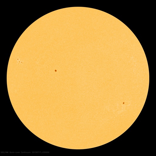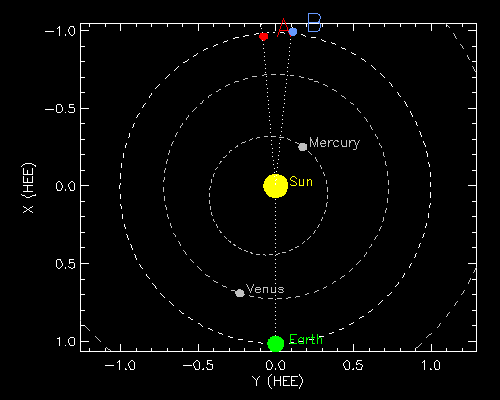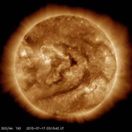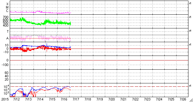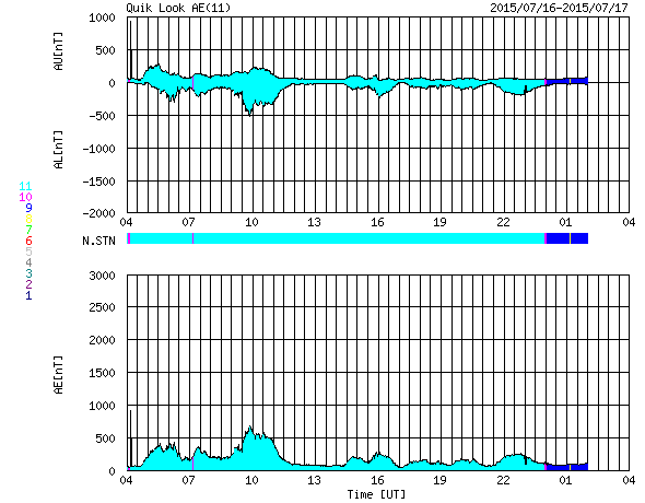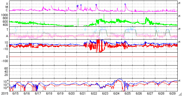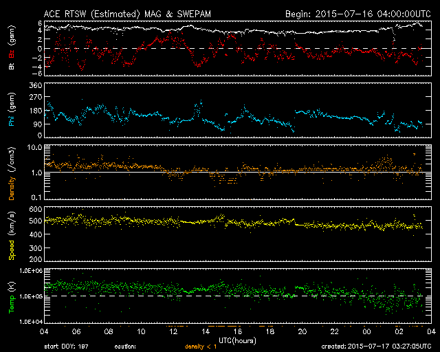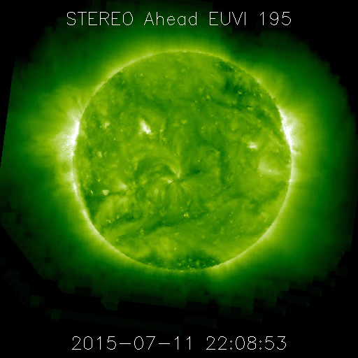 2015/ 7/17 12:27 更新 高速の太陽風は終わりつつあります。STEREO Ahead衛星の観測が再開されています。 担当 篠原 太陽の反対側を通過していたSTEREO Ahead衛星の観測が、 再開されています。 Webページでは、今週の半ばから最新画像の公開が始まっていた様で、 観測再開後の7月11日から16日までの EUVI 195カメラによる動画を1枚目に掲載します。 7月3日頃にこちら側を通過していたコロナホールが、 太陽の反対側を進んでいる様子を見ることができます。 そして、STEREO衛星の位置を2枚目に掲載します。 「A」と記されたAhead衛星は、 太陽の向こう側を右から左へ通り抜けたところです。 今後、更に左に進んで行き、 地球へやって来る太陽風の変化を、 先回りして観測することができる位置に入ります。 STEREO Ahead衛星の今後の活躍が楽しみです。 太陽風の速度は、500km/秒から460km/秒へ少し下がり、 高速風は終わりに向かっている様です。 磁場強度は、4〜5nTと平均的な値を推移しています。 磁気圏の活動も小さくなっていて、 AE指数は、グラフの前半に500nTの変化がありますが、 以降は、200nT程度の弱い変化のみです。 太陽風は、この後は低速の状態に向かいそうです。 27日周期の図では、前周期の6月22日から太陽風が強まっていますが、 これは、フレアによる突発性の乱れで、周期性はありません。 更に27日前の周期では、太陽風は穏やかに推移していました。 太陽は、フレアの発生は特になく、穏やかです。