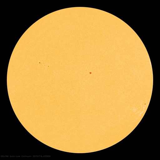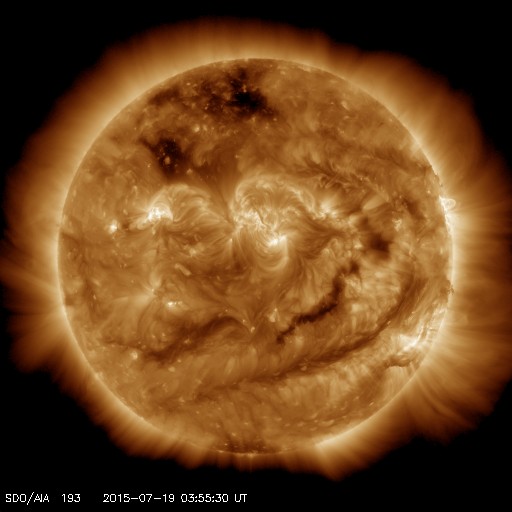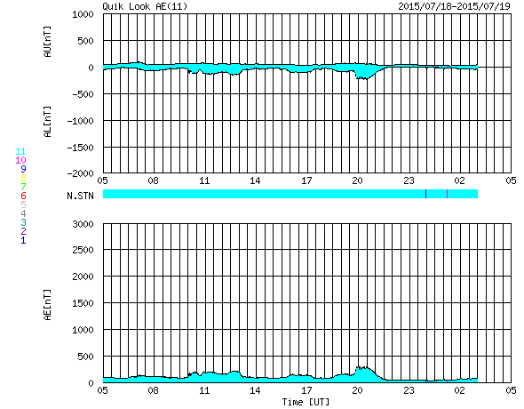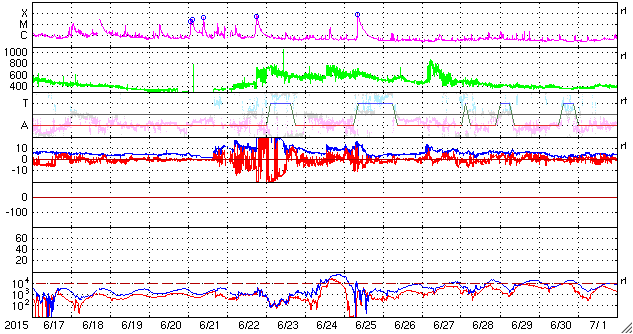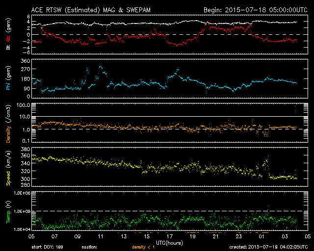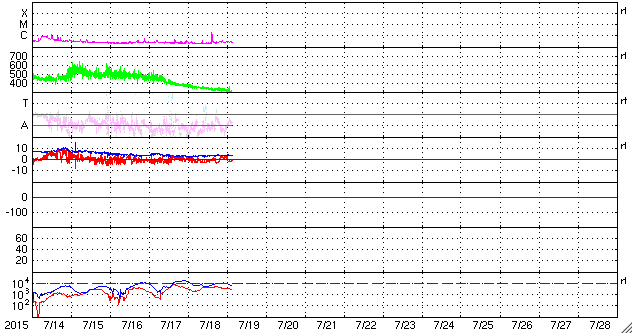 2015/ 7/19 13:02 更新 太陽風は300km/秒まで低速になっています。太陽も穏やかです。 担当 篠原 低速になった太陽風は、350km/秒から更に速度を下げて、 現在は300km/秒とかなり遅くなっています。 磁場強度は、3nTから4nTへやや戻り気味です。 太陽風磁場の南北成分は、 小さい振れ幅ですが、南寄りに推移しています。 速度も遅くなっているので、 磁気圏への影響は弱くなっていますが、 AE指数には、200nT前後の小さい変化が起きています。 低速になった太陽風は、どこまで続くでしょうか。 太陽のフレア活動も穏やかです。 昨夜、西の端近くの2388黒点群で、 C1.8の小規模フレアが発生しました。 X線グラフの変化がCクラスに達するのは、4日ぶりです。 特に活動的な領域もないので、 太陽はこの後も穏やかに推移しそうです。 ![]() SDO衛星のAIA193カメラによる太陽コロナの様子 (c) SDO (NASA) ![]() SDO衛星による太陽の可視光写真。マウスの矢印を写真に重ねると、黒点番号付きの写真に切り替わります。 (c) SDO (NASA) ![]() ACEが観測した太陽風の磁場(1番上の枠、白線は全体の強度、赤線は南北成分) および、太陽風の密度(3番目の橙線)、速度(4番目の黄線) (c) NOAA/SWPC ![]() リアルタイムAE指数 下段のAEグラフの値が高くなると、オーロラ活動が活発化しています。 (c) 京都大学, NICT ![]() 27日の太陽周期に合わせたデータプロット 太陽が同じ面を地球に向けていた27日前の変化から、今後を予想することができます。 (c) 作図:宇宙天気ニュース