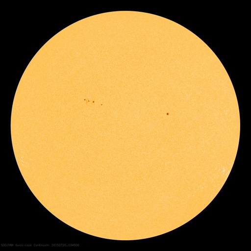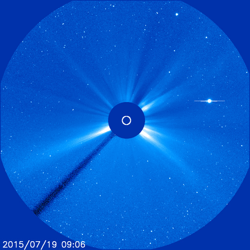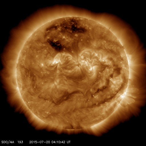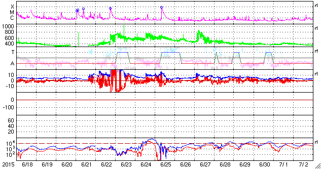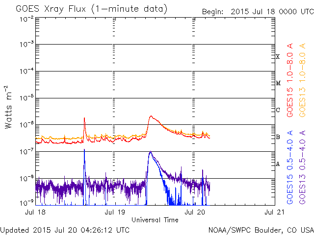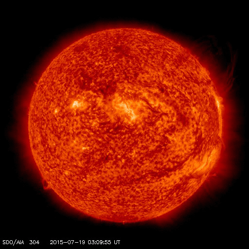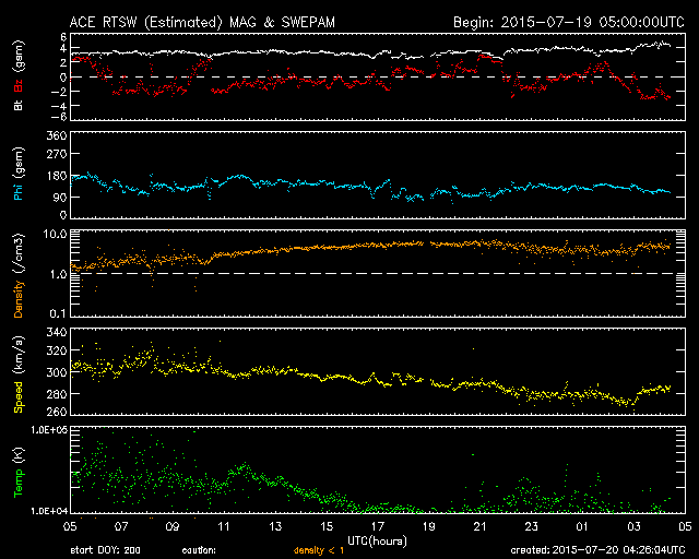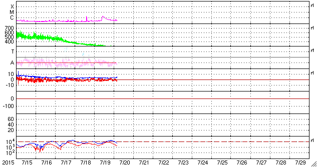 2015/ 7/20 13:26 更新 太陽風の速度は280km/秒に下がり、かなり低速の風になっています。 担当 篠原 太陽風の速度は、300km/秒から更に下がって、 今朝くらいから、280km/秒とかなり遅い風になっています。 磁場強度は、3〜4nTとやや弱い状態です。 磁場の南北成分は、小さく南北に変化する程度です。 速度がかなり遅くなっていることもあり、 オーロラの活動度を示すAE指数のグラフは、 小さい山がひとつある程度で、とても穏やかです。 低速の穏やかな太陽風は、しばらく続きそうです。 太陽では、昨夕、19日16時(世界時19日7時)に、 南西部(右下)でフィラメントの噴出が発生しています。 SDO衛星AIA304による動画を掲載します。 フィラメントの黒い帯が、勢いよく右下に噴き出しています。 SOHO衛星LASCO C3では、 CME(太陽ガスの放出現象)として観測されています。 この動画によると、ガスは右方向へ飛び出しているので、 地球への影響はなさそうです。 GOES衛星のX線グラフは、 このフィラメント噴出によるC2.1の変化以外にフレアの発生はなく、 太陽は穏やかです。