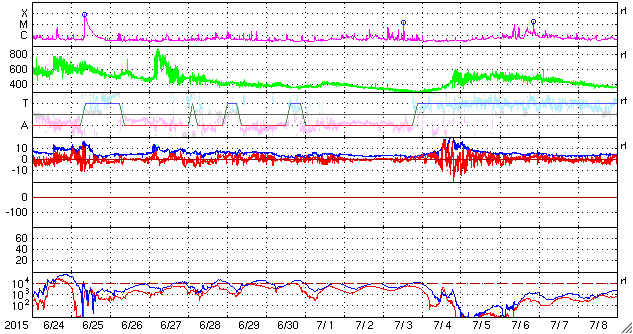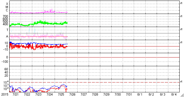 2015/ 7/23 11:31 太陽風の磁場の強まりは続き、磁気圏の活動をやや高めています。