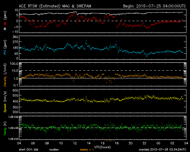 2015/ 7/21 11:56 太陽風の磁場が強まり、速度も少し上がっています。