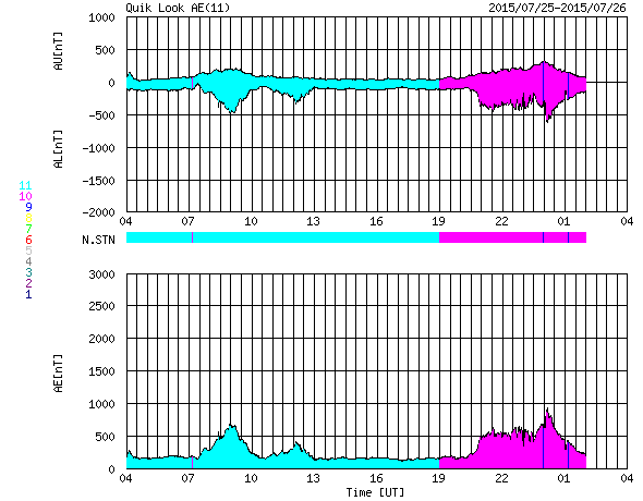 下段のAEグラフの値が高くなると、オーロラ活動が活発化しています。