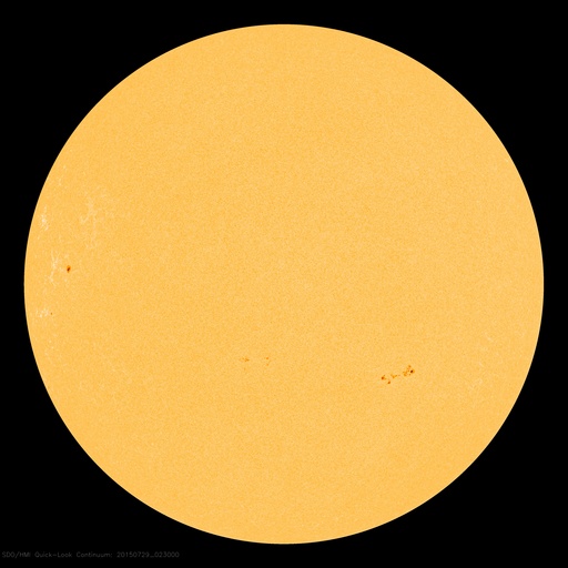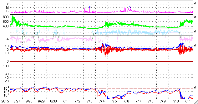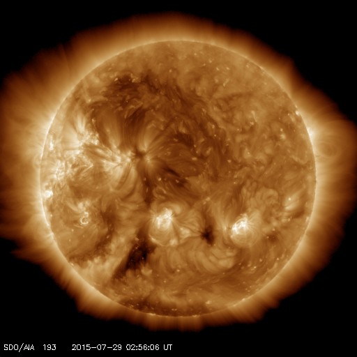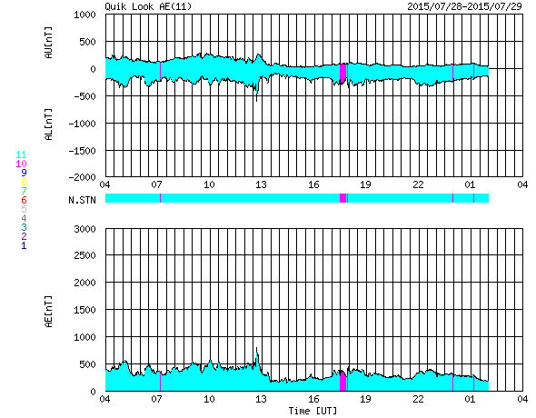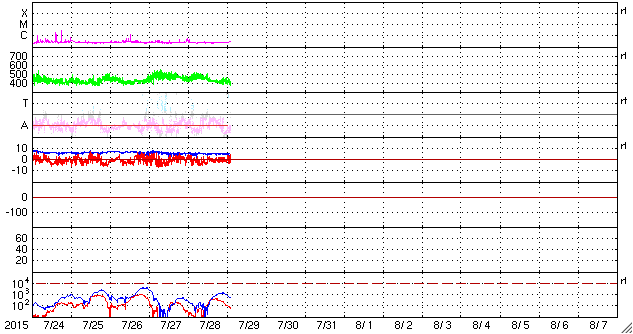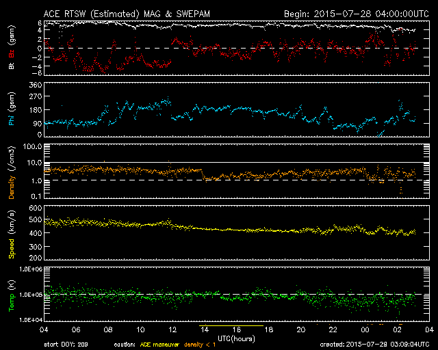 2015/ 7/29 12:09 更新 太陽風は400km/秒と平均的な状態です。太陽も穏やかです。 担当 篠原 太陽風の速度は、450km/秒から400km/秒へ下がっています。 磁場強度は、5nTで安定していますが、 最後の辺りで、4nTへ下がりかけています。 太陽風は、平均的な状態で穏やかです。 磁気圏も基本的には穏やかですが、 太陽風磁場の南北成分の振れ方により、 AE指数のグラフの前半は、変化が少し大きくなり、 後半は変化が弱まっています。 昨日紹介した様に、 SDO衛星AIA193の南半球に見えるコロナホールの様子が、 前周期と変わり、左右に2つに分かれています。 このため、27日周期の図の前周期の太陽風の変化と 様子が変わっている可能性があります。 右の小さいコロナホールの影響は、明後日くらい、 左の少し大きいコロナホールの影響は、4日後くらいに、 それぞれ変化が見られるかもしれません。 前周期の変化と比べながら、注目して下さい。 太陽は、X線のグラフに特に変化はなく、穏やかです。 東の2391黒点群の下に、小さい黒点がひとつ見えています。 ![]() SDO衛星のAIA193カメラによる太陽コロナの様子 (c) SDO (NASA) ![]() SDO衛星による太陽の可視光写真。マウスの矢印を写真に重ねると、黒点番号付きの写真に切り替わります。 (c) SDO (NASA) ![]() ACEが観測した太陽風の磁場(1番上の枠、白線は全体の強度、赤線は南北成分) および、太陽風の密度(3番目の橙線)、速度(4番目の黄線) (c) NOAA/SWPC ![]() リアルタイムAE指数 下段のAEグラフの値が高くなると、オーロラ活動が活発化しています。 (c) 京都大学, NICT ![]() 27日の太陽周期に合わせたデータプロット 太陽が同じ面を地球に向けていた27日前の変化から、今後を予想することができます。 (c) 作図:宇宙天気ニュース