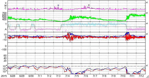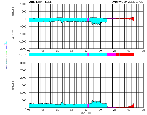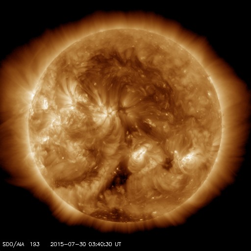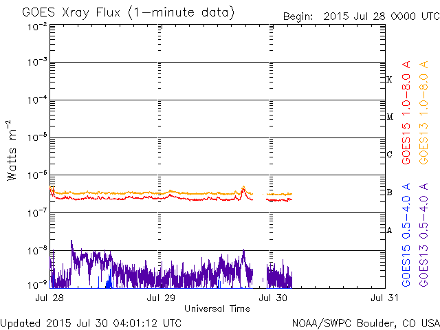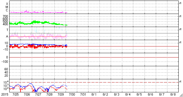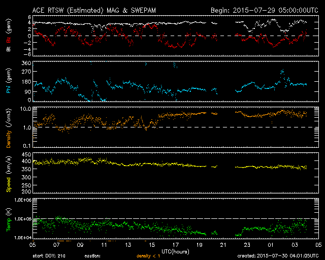 2015/ 7/30 13:02 更新 太陽風は350km/秒の低速風に変わっています。太陽は穏やかです。 担当 篠原 太陽風の速度は、400km/秒から350km/秒へ下がり、 低速の状態に変わっています。 磁場強度は、4nTで安定していますが、 グラフの最後で強弱の変化をしています。 27日周期の図で前周期のデータを見ると、 7月3日にセクターの切り替わりが到来しています。 その回帰が近づいているのかもしれません。 磁気圏は穏やかで、AE指数は大きな変化はありません。 全体の太さが急に変わっていますが、 これはデータの問題が原因だと思います。 SDO衛星AIA193では、 左側のコロナホールが中心に達しています。 太陽も静穏で、 GOES衛星のX線グラフはほとんど変化していません。 黒点は、南西(右下)の2390群は小さくなり、 隣の2389群はほとんど見えなくなっています。 一方、東側では、昨日現れた黒点に2392群と番号が付き、 更に東側から新しく黒点が現れています。 しかし、活動している様子は特に見られず、 太陽の穏やかな状態はこのまま続きそうです。