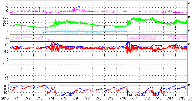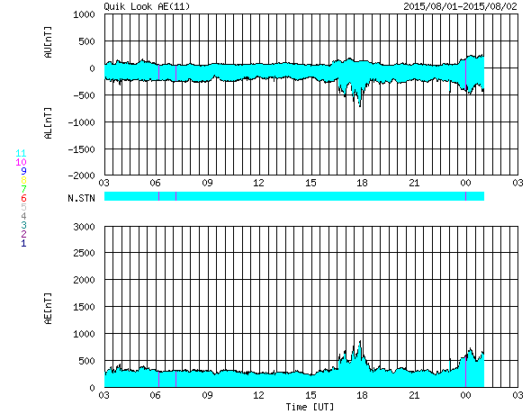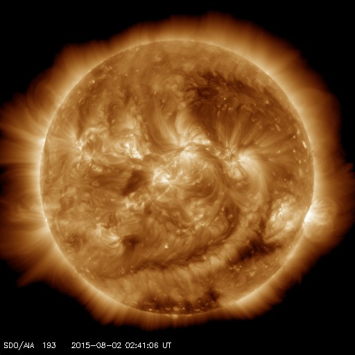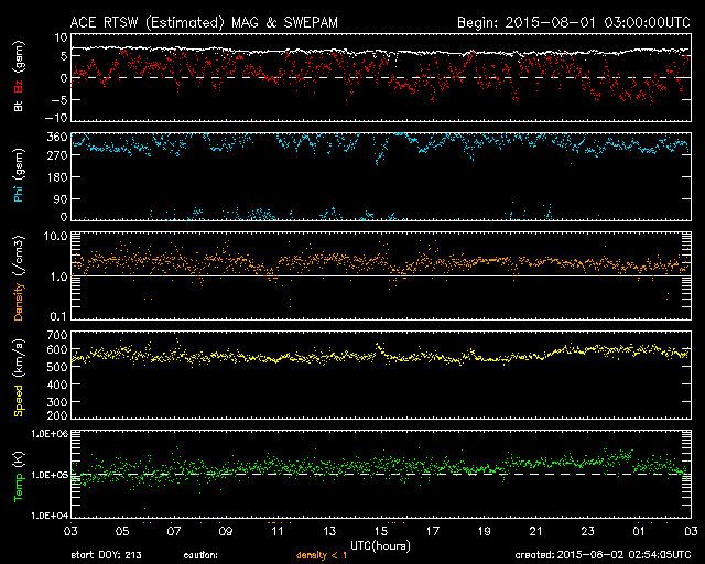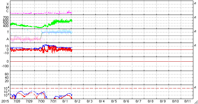 2015/ 8/ 2 11:54 更新 500km/秒台後半の高速太陽風が続いています。C1のフレアが起きました。 担当 篠原 太陽風の速度は、550〜600km/秒と高速の状態が続いています。 磁場強度は、6nTと平均的な値で安定しています。 磁場の南北成分は、グラフの前半は北寄りでしたが、 後半は南にも振れる様になっています。 速度が高まっていることもあって、 AE指数は後半に変化が2回発生しています。 (グラフ全体が太くなっているのは、データの問題ではないかと思います) 高速太陽風の真っ最中ですが、 27日周期の図を見ると、 前周期は、7月6〜7日と2日ほどかけて速度が下がっています。 これを参考にすると、今回の高速風ももう2〜3日程度かもしれません。 太陽では、西の端に沈みかけている2390黒点群で、 C1.5の小規模フレアが発生しています。 Cクラスに達するフレアの発生は、 7月26日以来で、6日ぶりです。 この領域はもうすぐ見えなくなるので、 太陽はこの後も穏やかな状態が続きそうです。 ![]() SDO衛星のAIA193カメラによる太陽コロナの様子 (c) SDO (NASA) ![]() SDO衛星による太陽の可視光写真。マウスの矢印を写真に重ねると、黒点番号付きの写真に切り替わります。 (c) SDO (NASA) ![]() ACEが観測した太陽風の磁場(1番上の枠、白線は全体の強度、赤線は南北成分) および、太陽風の密度(3番目の橙線)、速度(4番目の黄線) (c) NOAA/SWPC ![]() リアルタイムAE指数 下段のAEグラフの値が高くなると、オーロラ活動が活発化しています。 (c) 京都大学, NICT ![]() 27日の太陽周期に合わせたデータプロット 太陽が同じ面を地球に向けていた27日前の変化から、今後を予想することができます。 (c) 作図:宇宙天気ニュース