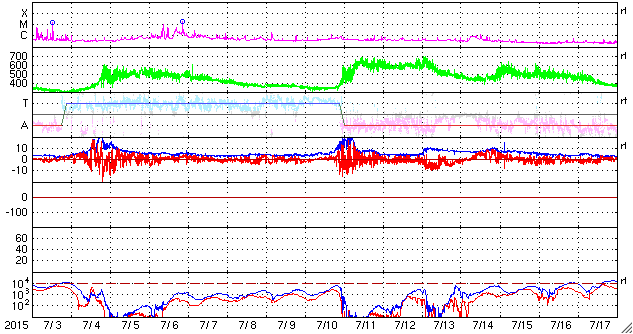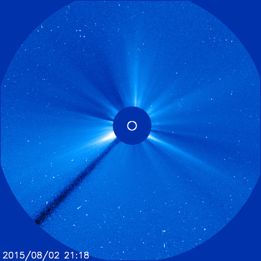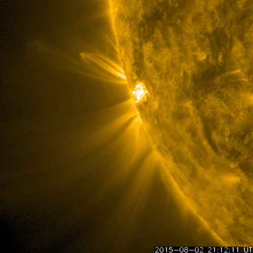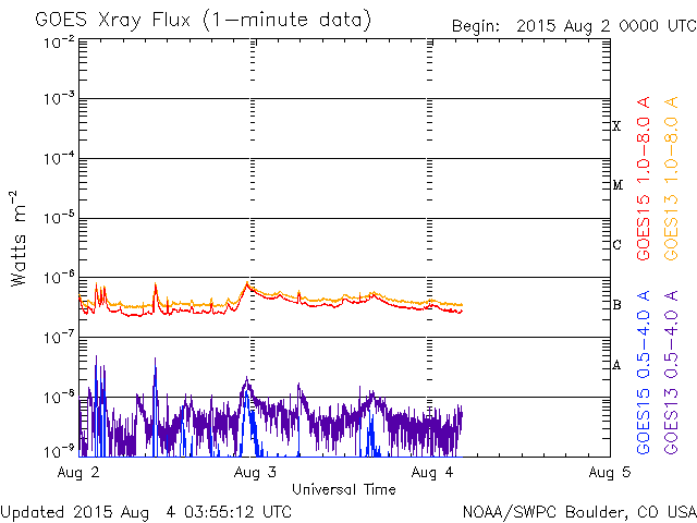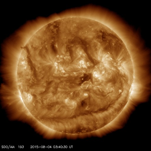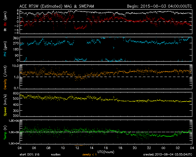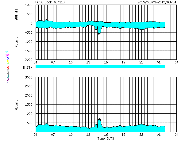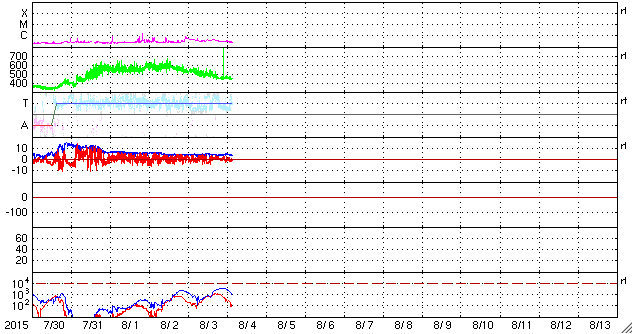 2015/ 8/ 4 12:55 更新 太陽の東端でCMEが発生しています。高速の太陽風は終わりかけています。 担当 篠原 STEREO Ahead衛星によると、太陽の南東端(左下)の向こう側で、 3日8時(世界時2日23時)頃にフレアが発生した様です。 そのフレアに続く、ポストフレアループの変化を、 SDO衛星AIA171の動画で紹介します。 ちょうど端ぎりぎりで起きたので、 次々と発生するきれいなループの姿を良く見ることができます。 このフレアに伴って、CME(太陽ガスの放出現象)も発生しています。 SOHO衛星LASCO C3の動画を掲載します。 フレアの発生が一週間後であれば、地球へも影響がやって来たでしょう。 この後、太陽の東端からどの様な領域が現れるのか、 活動度も含めて注目して下さい。 GOES衛星のX線グラフは、特に変化なく、 太陽のこちら側は穏やかです。 東端から現れた新しい黒点に、 2395群、2396群と番号が付いています。 太陽風は、速度の低下が続き、 550km/秒から450km/秒へ下がっています。 磁場強度は、4〜5nTで安定しています。 太陽風は平均的な状態に戻りつつあります。 磁気圏も穏やかで、オーロラの活動度を示すAE指数は、 真ん中にひとつ変化があるだけで、前後は穏やかです。