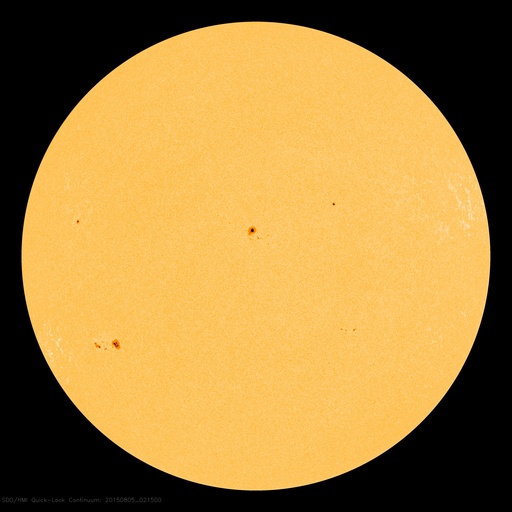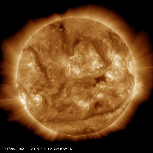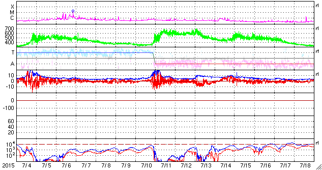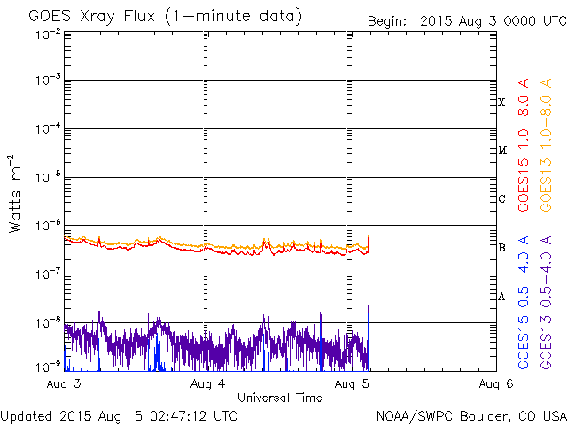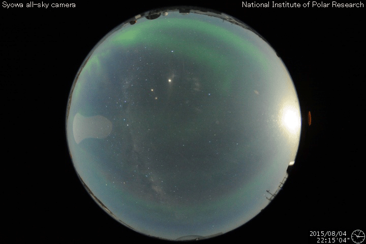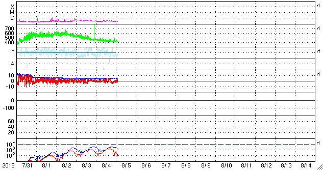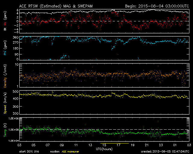 2015/ 8/ 5 11:48 更新 太陽風は平均的な速さに戻りました。太陽は穏やかです。 担当 篠原 太陽風の速度は、420km/秒と平均的な速さに戻っています。 磁場強度も、4〜5nTで落ち着いています。 磁場の南北成分は、グラフの後半からやや南寄りになっています。 このため、AE指数のグラフも後半に弱い変化が起きていて、 南極の昭和基地では、世界時4日22時頃に にぎやかなオーロラの活動を観測しています。 全天カメラによる動画をご覧下さい。 27日周期の図を見ると、前周期の太陽風は次第に低速になり、 7月11日に再び高速風が到来しています。 この時の高速風の発生源と考えられるコロナホールは、 今回はかなり小さくなっています。 今回はどの程度の影響が見られるのか、 明後日以降の太陽風の変化に注目して下さい。 太陽は、南東(左下)の2396黒点群が大きくなっています。 しかし、X線グラフの変化は小さく、 フレアの活動は特に高まってはいません。 更に2396群の発達が続くと、 フレアも起きるようになるかもしれません。