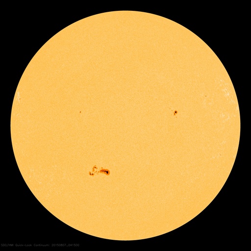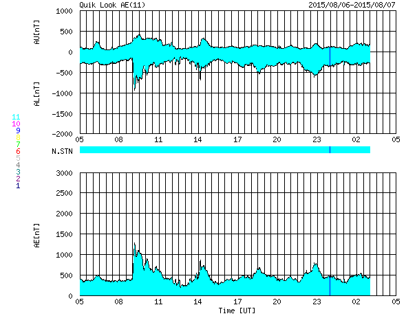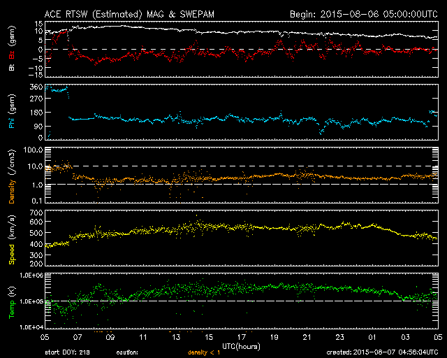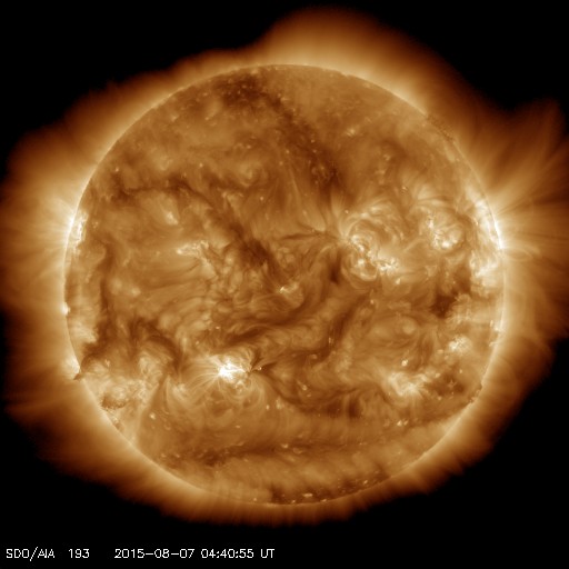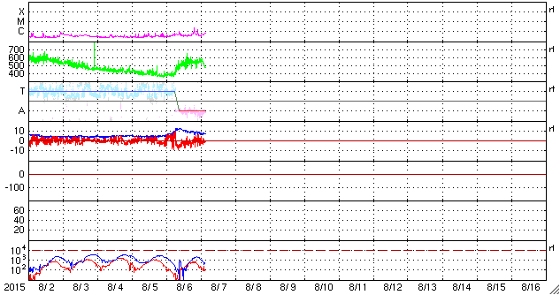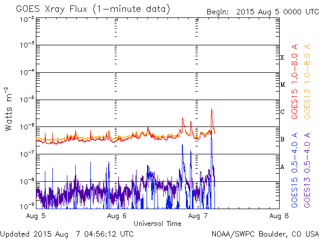 2015/ 8/ 7 13:57 更新 C4.8の小規模フレアが起きました。太陽風は500km/秒台の高速風になりました。 担当 篠原 今日の昼、7日12時半(世界時7日3時半)に、 太陽の中央南側の2396黒点群で、 C4.8の小規模フレアが発生しました。 特に大きいフレアでもありませんが、 C4を超えるX線強度のフレアは、 世界時7月6日のM1.7以来で、1ヶ月ぶりのことです。 このところ、太陽が静かだったことがよく分かります。 2396黒点群は、昨日から今日にかけても大きく変化をしています。 SDO衛星による拡大写真の動画を掲載します。 この領域では、小さい活動も頻繁に起きています。 今後もフレアの発生に注目して下さい。 太陽風は、昨日の午後から速度が上がり始めて、 500km/秒台の高速風になり、 今朝にかけて550km/秒近くまで高まりました。 しかし、そこから速度は下がり始め、 現在は460km/秒とやや高速程度です。 磁場強度は、7nTから13nTへ高まりましたが、 速度が上がり始めた頃から低下に向かい、 現在は6nTと平均的な強度に戻りつつあります。 磁場の南北成分は、弱い南寄りになりました。 このため、磁気圏でも変化がやや強まっていて、 AE指数は(データが太くなっていて、読みにくいですが)、 500nT前後の小中規模の変化が続いている様です。 27日周期の図を見ると、1日ほど早まっていますが、 前周期の太陽風の強まりが回帰した様です。 太陽風磁場のセクターの切り替わりも到来しています。 前周期のグラフを見ると、 太陽風の速度は、2日ほど経って一回下がり、その後再び上がって、 一週間近く高まった状態が続きました。 今回はどの様な変化になるのか、見比べながら注目して下さい。 ![]() SDO衛星による2396黒点群の1日の変化。 (c) SDO (NASA)、動画加工 : 宇宙天気ニュース ![]() SDO衛星のAIA193カメラによる太陽コロナの様子 (c) SDO (NASA) ![]() SDO衛星による太陽の可視光写真。マウスの矢印を写真に重ねると、黒点番号付きの写真に切り替わります。 (c) SDO (NASA) ![]() GOES衛星の太陽X線データ (c) NOAA/SWPC ![]() ACEが観測した太陽風の磁場(1番上の枠、白線は全体の強度、赤線は南北成分) および、太陽風の密度(3番目の橙線)、速度(4番目の黄線) (c) NOAA/SWPC ![]() リアルタイムAE指数 下段のAEグラフの値が高くなると、オーロラ活動が活発化しています。 (c) 京都大学, NICT ![]() 27日の太陽周期に合わせたデータプロット 太陽が同じ面を地球に向けていた27日前の変化から、今後を予想することができます。 (c) 作図:宇宙天気ニュース