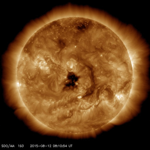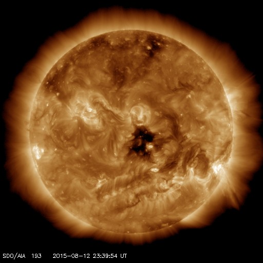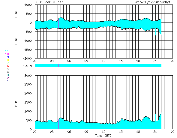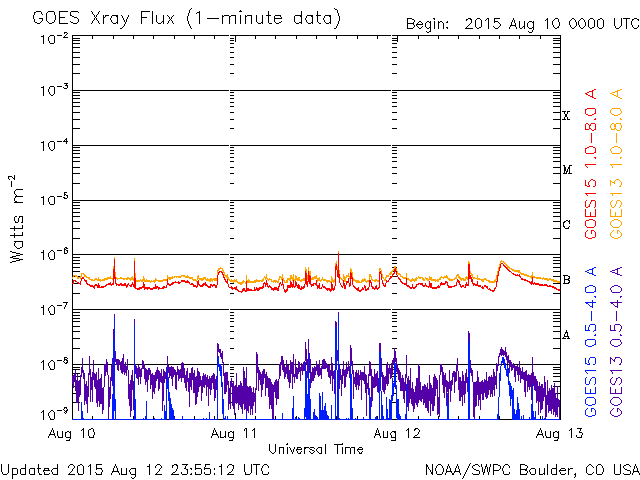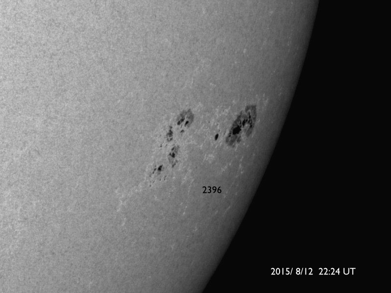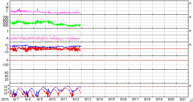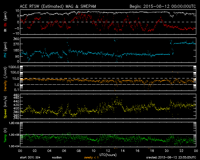 2015/ 8/13 08:56 更新 太陽風は平均的な速さです。太陽も静かです。 担当 篠原 太陽風の速度は、380km/秒から400km/秒へ少しだけ上がり、 平均的な状態が続いています。 磁場強度は、8nTに少し強まりましたが、 今朝になって、6nTへ下がりかけています。 どちらも小さい変化で、 太陽風は全体としては穏やかです。 磁場の南北成分は、南寄りの傾向になっていて、 -5nT近い南向きに振れる時間帯も見られます。 磁気圏でも小規模の活動が続いている様で、 AE指数は小さい変化が続いています。 これから2日程度は、このまま穏やかに推移して、 その後、SDO衛星AIA193の太陽の中心部に見える コロナホールの影響がやって来るかもしれません。 太陽は、2396黒点群が、いよいよ西の端に沈もうとしています。 また、2398、2399群は見えなくなった様で、 太陽の中央部は、2400群だけになっています。 太陽の中央部の右下側で、フィラメント噴出が発生しています。 SDO衛星AIA193の動画を掲載します。 この噴出によりCME(太陽ガスの放出現象)も発生している様ですが、 SOHO衛星の写真が揃っていないので、詳細はまだ分かりません。 発生位置や噴出の様子から、 地球への影響は小さいのではないかと思います。 放射線帯の高エネルギー電子は、 GOES15(青線)が10,000に達しない程度で、 既に減少を始めている様です。 ![]() 2396黒点群の拡大写真。SDO衛星。 (c) SDO (NASA)、 (写真加工 : 宇宙天気ニュース) ![]() 太陽の中央部右下で発生したフィラメント噴出の様子。SDO衛星AIA193。 (c) SDO (NASA) ![]() SDO衛星のAIA193カメラによる太陽コロナの様子 (c) SDO (NASA) ![]() SDO衛星による太陽の可視光写真。マウスの矢印を写真に重ねると、黒点番号付きの写真に切り替わります。 (c) SDO (NASA) ![]() ACEが観測した太陽風の磁場(1番上の枠、白線は全体の強度、赤線は南北成分) および、太陽風の密度(3番目の橙線)、速度(4番目の黄線) (c) NOAA/SWPC ![]() リアルタイムAE指数 下段のAEグラフの値が高くなると、オーロラ活動が活発化しています。 (c) 京都大学, NICT ![]() 27日の太陽周期に合わせたデータプロット 太陽が同じ面を地球に向けていた27日前の変化から、今後を予想することができます。 (c) 作図:宇宙天気ニュース