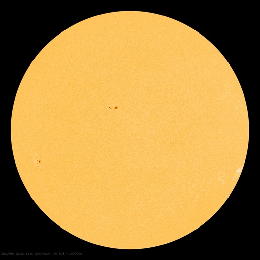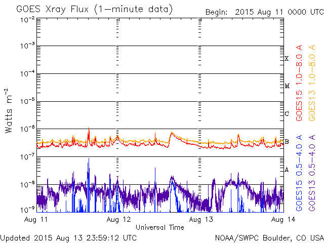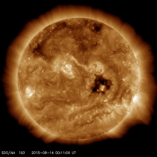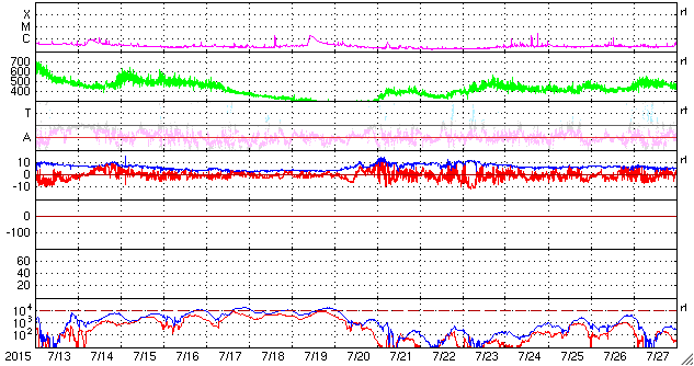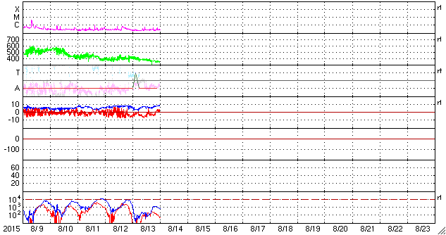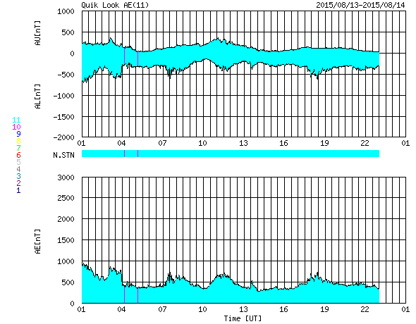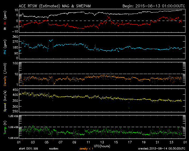 2015/ 8/14 09:31 更新 太陽風は350km/秒と低速になっています。太陽は穏やかです。 担当 篠原 昨日紹介したフィラメント噴出によるCMEについては、 この時間帯のSOHO衛星の写真が欠けたままで、 CMEの様子を見ることができませんでした。 方向や規模から考えて、地球への影響は、 やって来ても小さい変化だと思います。 太陽風の速度は、400km/秒から350km/秒へ下がり、 低速の風になっています。 磁場強度は、9nTへ少し高まっています。 SDO衛星AIA193の太陽中央部のコロナホールは、 次第に西に進んで、 地球へ影響が及び始める目安の位置に近づいています。 現在の太陽風の磁場強度の高まりは、 影響の始まりと関係しているかもしれません。 磁場だけが高まっているのか、 追いかける様に速度が上昇を始めるのか、 引き続き注目して下さい。 磁場の南北成分は、グラフの中盤にかけて南寄りになっています。 このため、磁気圏の活動もある程度発生している様で、 オーロラの活動度を示すAE指数は、小幅の変化が続いています。 太陽風のグラフの終わりでは、南北成分は0nT付近で変化しています。 この傾向が続く様だと、速度が下がっていることもあり、 磁気圏は静かになるでしょう。 太陽の中央部のコロナホールは、 27日前の前周期よりも広がっています。 影響がどのタイミングで始まるか、どの程度の変化がやって来るのか、 27日周期の図で前周期の様子と見比べながら、変化に注目して下さい。 太陽は、2396黒点群が西の端に没して、 ほとんど見えなくなっています。 一方、東側に新しい黒点が現れて、 2401群と番号が付けられています。 目立ったフレアの発生はなく、太陽は穏やかです。 放射線帯の高エネルギー電子は減少して、 GOES15(青線)の値は、1000まで下がっています。