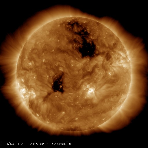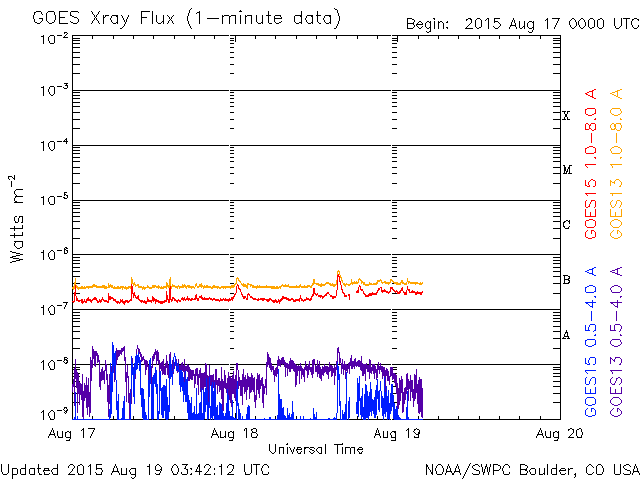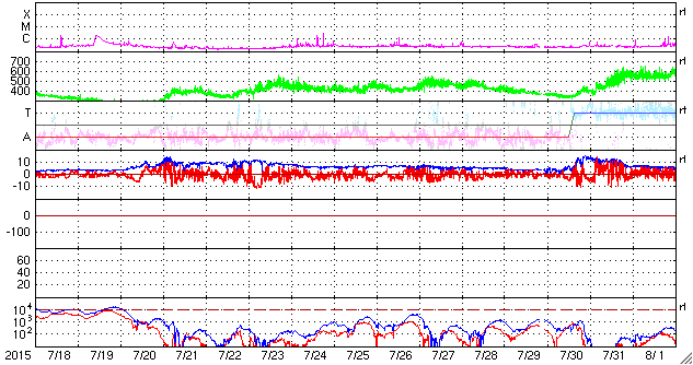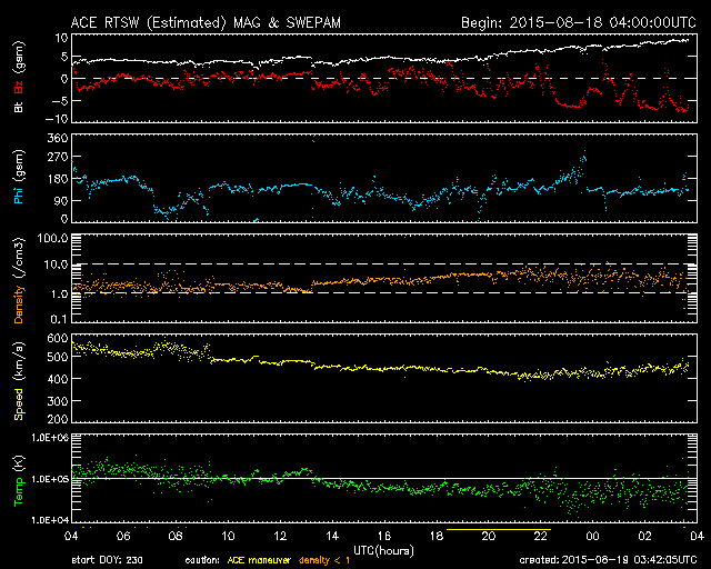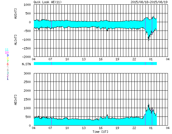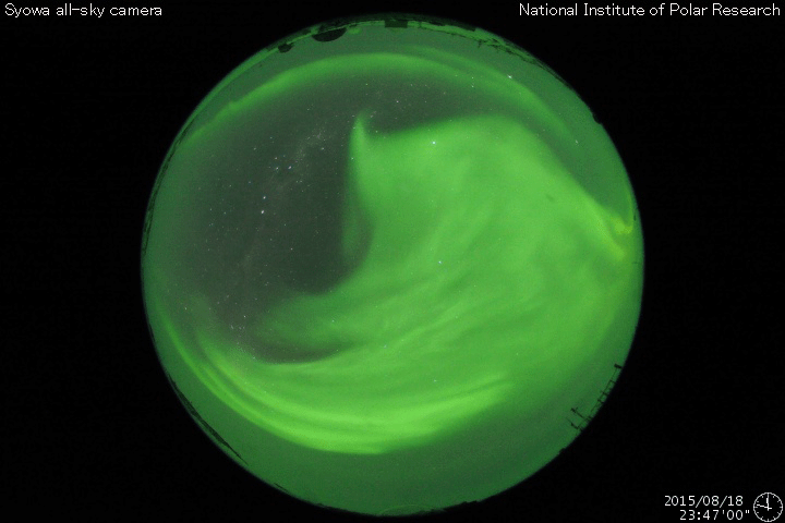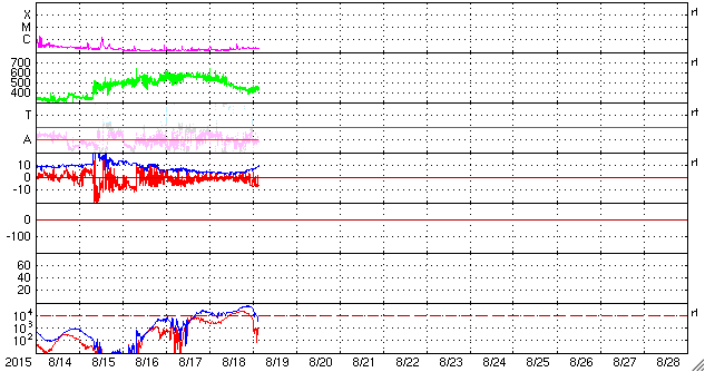 2015/ 8/19 12:43 更新 高速の太陽風は終わりましたが、磁場が強まって、磁気圏の活動をやや高めています。 担当 篠原 太陽風は、昨日の午後から少しずつ速度が下がり、 今朝には、420km/秒と平均的な速さに戻りました。 現在も、440km/秒とそのまま安定しています。 一方、磁場強度は、4nTに下がっていたのですが、 今朝からゆっくりと上がり始め、現在は8nTと少し強まっています。 それとともに、磁場の南北成分は大きく南に振れるようになり、 -5nTを超える程度に強まっています。 このため、今朝より、磁気圏の活動度もやや高まっていて、 AE指数は、グラフの後半で1000nTに達する変化を記録しています。 この頃の南極・昭和基地のオーロラを、 全天カメラの動画で紹介します。 途中、光の帯が激しく変化する様子が見事です。 SDO衛星AIA193の太陽写真では、 北半球のコロナホールが西に進んでいます。 こちらの影響も近づいている可能性があります。 太陽では、南東の端から新しく2403黒点群が現れました。 目立ったフレアの発生はなく、太陽は穏やかです。 放射線帯の高エネルギー電子は、更に数値が高まり、 GOES15(青線)は、50,000に、 GOES13(赤線)は、20,000に達しています。