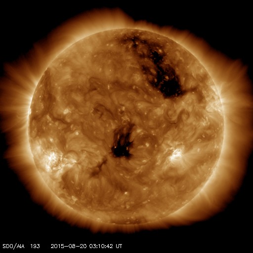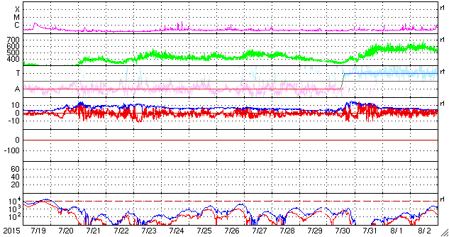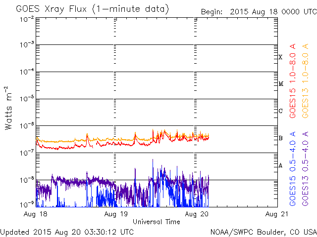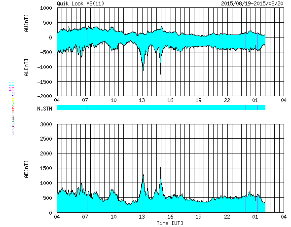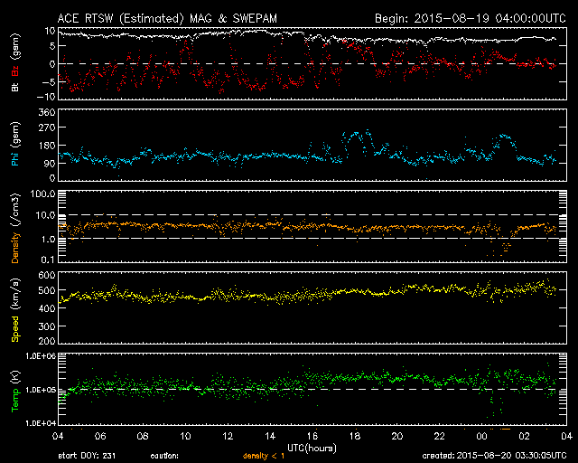 2015/ 8/20 12:30 更新 太陽風は500km/秒の高速風に変わっています。カナダのオーロラをどうぞ。 担当 篠原 カナダの高坂雄一さんより、世界時19日6時から10時にかけて、 地平線上空に薄いオーロラが出続けていたとのことで、 写真を2枚いただきました。 太陽風の磁場の南北成分が、 -5nT前後と南向きに振れていた頃の活動です。 AE指数は、800nT前後と中程度の変化をしています。 高坂さんとしては、思ったより良く見えたという印象だった様です。 一昨日の写真と比べると(2枚目どうしがほぼ同じ位置です)、 オーロラは地平線近くに限定されていて、縦の光の筋も控えめです。 磁気圏活動の高まりの違いが見えて、とても興味深いです。 どうもありがとうございます。 太陽風は、昨日のニュース以降ゆっくりと速度を上げて、 現在は500km/秒と高速の状態に変わっています。 磁場強度は、昨夜にかけて、10nT近くまで上がりましたが、 現在は7nTと少し下がっています。 磁場の南北成分は、グラフの前半は南寄り、 後半は0nT付近と様子が変化しています。 このため、AE指数も、前半は変化が目立っていますが、 後半はあまり動かなくなっています。 SDO衛星AIA193の北半球に広がっていたコロナホールの影響が、 地球に及び始めたようです。 また、AIA193の写真では、太陽の中央部にもコロナホールがあります。 ちょうど中央線に達しているので、 これから3日ほど経つと、続いてこちらの影響が到来しそうです。 太陽風は、来週の前半にかけて高まった状態が続く可能性があります。 太陽は、南東(左下)の2403黒点群が発達しています。 X線のグラフも、Bクラスの小さい変化が 頻繁に起きるようになっています。 今後、活動の規模が高まっていくかどうか、注目して下さい。 放射線帯の高エネルギー電子は、太陽風の変化を受けて、 昨日よりも下がっていますが、 GOES15(青線)は、まだ10,000に届いています。 太陽風が高まっているので、こちらも引き続き注目して下さい。