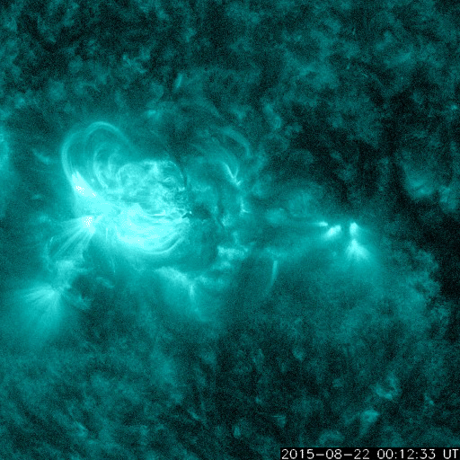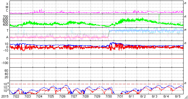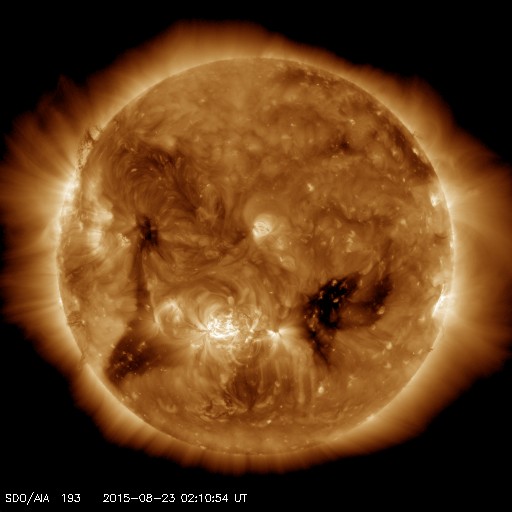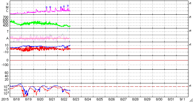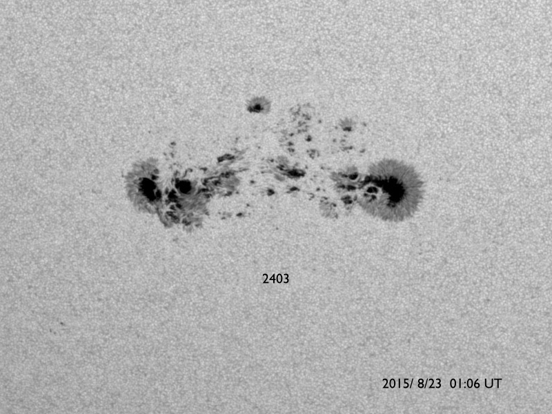2015/ 8/23 11:23 更新 2403黒点群の活動は続き、Mクラスフレアが3回発生しています。 担当 篠原 2403黒点群の活発な活動が続いています。 昨日のニュース以降も、22日15時半(世界時22日6時半)に、M1.2、 22日22時半(世界時22日13時半)に、M2.2、 23日6時半(世界時22日21時半)に、M3.5と、 Mクラスの中規模フレアを3回起こし、 Cクラスの小規模フレアも、10回ほど起こしています。 GOES衛星のX線グラフも、激しく変化しています。 可視光写真では、 2403群は黒点が昨日より更に大きくなっています。 引き続き、フレアの発生に注意してください。 今のところ、目立ったCMEの発生はない様ですが、 黒点群は太陽の中心部に達しているので、 CMEを起こすと、地球へ影響が及ぶ可能性が高くなっています。 太陽風は、速度が400km/秒と350km/秒の間を変化して、 低速気味になっています。 磁場強度は、5nTと10nTの間をゆっくりと変化していて、 やや強まった状態です。 SDO衛星AIA193の写真から、 コロナホールの影響が近づいている可能性があります。 まだ、はっきりした変化は見られませんが、 引き続き注目して下さい。 磁場の南北成分は、0nT付近から弱い南寄りになっています。 磁気圏でも小規模の変化が続いている様で、 AE指数は300〜500nTの変化が続いています。 放射線帯の高エネルギー電子は、大きく数を減らし、 1000程度に下がっています。 ![]() 2403黒点群で発生した、M1.2、M2.2、M3.5の中規模フレア。SDO衛星AIA131。 (c) SDO (NASA)、(動画加工 : 宇宙天気ニュース ) ![]() 2403黒点群の拡大写真。SDO衛星。 (c) SDO (NASA)、(写真加工 : 宇宙天気ニュース) ![]() SDO衛星のAIA193カメラによる太陽コロナの様子 (c) SDO (NASA) ![]() SDO衛星による太陽の可視光写真。マウスの矢印を写真に重ねると、黒点番号付きの写真に切り替わります。 (c) SDO (NASA) ![]() GOES衛星の太陽X線データ (c) NOAA/SWPC ![]() ACEが観測した太陽風の磁場(1番上の枠、白線は全体の強度、赤線は南北成分) および、太陽風の密度(3番目の橙線)、速度(4番目の黄線) (c) NOAA/SWPC ![]() リアルタイムAE指数 下段のAEグラフの値が高くなると、オーロラ活動が活発化しています。 (c) 京都大学, NICT ![]() 27日の太陽周期に合わせたデータプロット 太陽が同じ面を地球に向けていた27日前の変化から、今後を予想することができます。 (c) 作図:宇宙天気ニュース