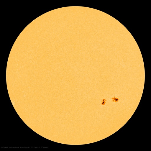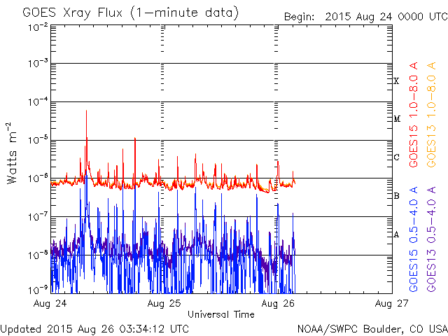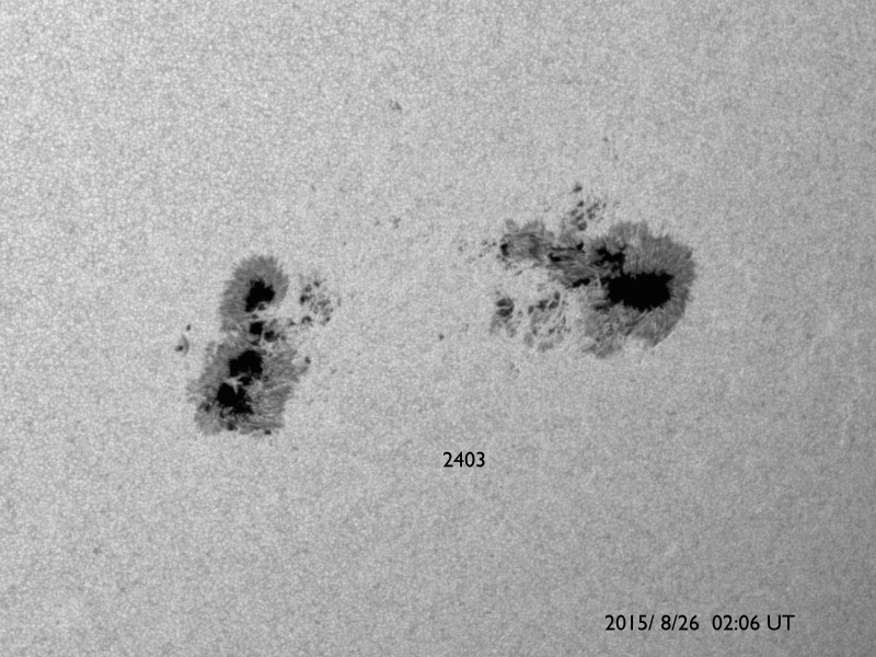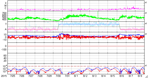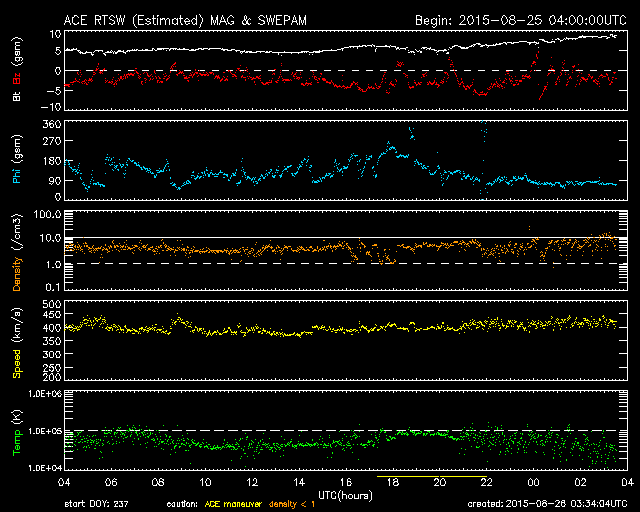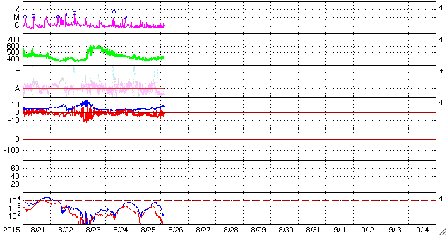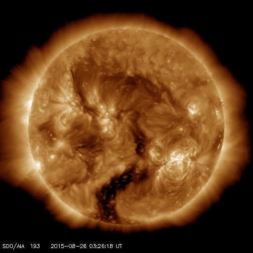2015/ 8/26 12:32 更新 2403黒点群の活動はやや低下しています。高速の太陽風が近づいている様です。 担当 篠原 2403黒点群は、太陽の西の端に次第に近付いています。 黒点としては現在も大きな姿をしていますが、 フレアの活動はやや弱まっている様子です。 昨日のニュース以降は、 C4.3を最大に、Cクラスの小規模フレアが11回発生していて、 回数は多いですが、規模は小さいものに留まり、 GOES衛星のX線グラフも変化が弱くなっている印象です。 2403群はこのまま弱まっていくのか、 一休みして再び活動を高めるのか、引き続き注目して下さい。 太陽風は、400〜420km/秒と平均的な速さで安定しています。 磁場強度は、5nTから8nTへ少しずつ高まっています。 磁場の南北成分は、南向きに振れる時間が目立っています。 このため、磁気圏の活動もやや高まっていて、 AE指数は、300〜600nT程度の中規模の変化が 何度も発生しています。 その中の、世界時25日23時頃のオーロラの様子を、 昭和基地の全天カメラの動画で紹介します。 AE指数のグラフの、最後の高まりの頃の様子です。 空全体を激しく覆う、オーロラの活動をご覧下さい。 SDO衛星AIA193の太陽コロナ写真を見ると、 太陽の中央部から南極へ向かって、 縦に長くコロナホールが広がっています。 27日前の写真と比べると、 コロナホールは、濃く大きく広がっています。 27日周期の図を見ると、前周期は7月31日から 太陽風の速度が高まるなどの影響が始まっています。 今回も同様と考えると、明日、27日くらいになりそうですが、 コロナホールが広がっていることを考えると、 現在のACEの太陽風磁場の強まりは、 既に変化の始まりかもしれません。 前回は600km/秒近い高速風が到来し、4日ほど高まりが続きました。 今後の太陽風の変化と、磁気圏の活動の高まりに注目して下さい。
