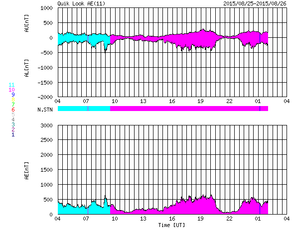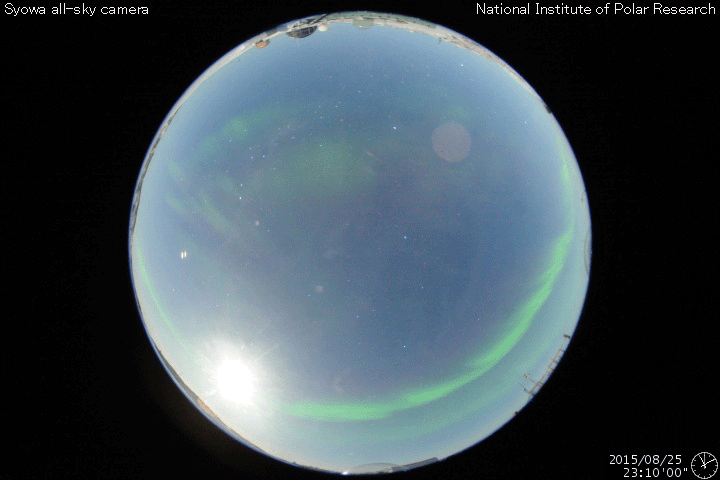 (c) SDO (NASA)、 (写真加工 : 宇宙天気ニュース) ![]() 南極の昭和基地で全天カメラにより撮影された、世界時25日23時のオーロラ。 (c) 国立極地研究所、(動画加工 : 宇宙天気ニュース) ![]() SDO衛星のAIA193カメラによる太陽コロナの様子 (c) SDO (NASA) ![]() SDO衛星による太陽の可視光写真。マウスの矢印を写真に重ねると、黒点番号付きの写真に切り替わります。 (c) SDO (NASA) ![]() GOES衛星の太陽X線データ (c) NOAA/SWPC ![]() ACEが観測した太陽風の磁場(1番上の枠、白線は全体の強度、赤線は南北成分) および、太陽風の密度(3番目の橙線)、速度(4番目の黄線) (c) NOAA/SWPC ![]() リアルタイムAE指数 下段のAEグラフの値が高くなると、オーロラ活動が活発化しています。 (c) 京都大学, NICT ![]() 27日の太陽周期に合わせたデータプロット 太陽が同じ面を地球に向けていた27日前の変化から、今後を予想することができます。 (c) 作図:宇宙天気ニュース