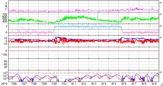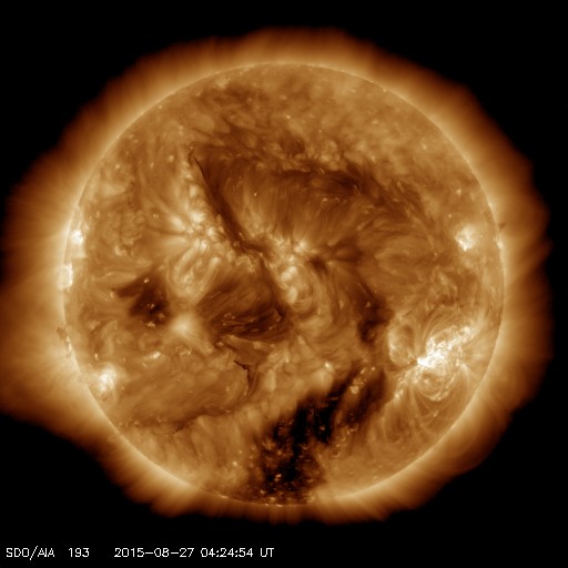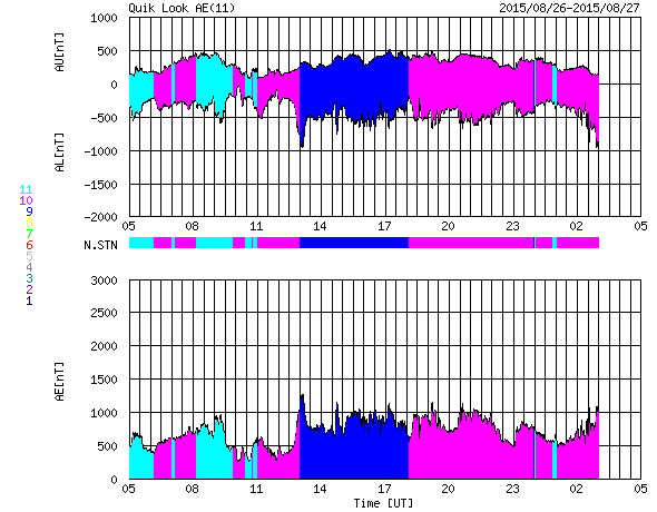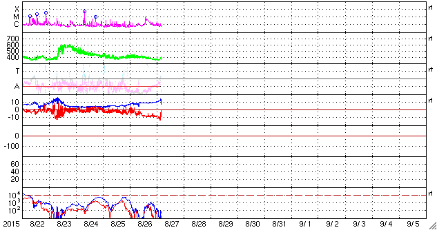 2015/ 8/27 13:32 更新 太陽風磁場が南に大きく振れ、磁気圏の活動が高まっています。 担当 篠原 昨日のニュース以降、太陽風の磁場強度は10nTに上がり、 磁場の南北成分は、南向きに大きく振れました。 特に、26日20時(世界時26日11時)以降は、 -10nT近い強い南向きが続き、 半日以上経った、27日12時(世界時27日3時)頃まで続いています。 その間、太陽風の速度は400km/秒から350km/秒へ低下しました。 変化の様子から、CMEによって噴出した磁場のかたまりが、 地球まで流れて来た様です。 SOHO衛星の画像を調べると、 21日に発生したMクラスのフレアに関連して、淡いCMEが発生していて、 この乱れが、5日近くかかって地球に到達した可能性があります。 磁場が南に大きく振れたため、磁気圏の活動も高まり、 AE指数は1000nTの活発な変化が半日ほど続いています。 また、京都大学によるDst指数の速報値は、 -89nTまで下がっていて(強まっていて)、 中規模の磁気嵐になっています。 太陽風のデータは、最新のところで変化が起きています。 磁場強度が15nTに上がって、すぐに8nTくらいに下がり、 -15nTまで強まっていた南北成分は、急に0nT近くに戻っています。 速度は、400km/秒に少し上がっています。 この後、太陽風の磁場強度や南北成分がどの様に変化するか注目して下さい。 それによって、今後の磁気圏の活動度も変化します。 一方、SDO衛星AIA193の写真では、南半球のコロナホールが西に進み、 地球へ影響が及び始める目安の位置に近付いています。 今後は、この領域からの高速風にも注意が必要です。 太陽の2403黒点群は、 26日22時半(世界時26日13時半)にC9.5、 27日0時(世界時26日15時)にC5.0と、大きいCクラスのフレア2つと、 C1の小さいフレアを5回ほど起こしています。 黒点は大きな姿を保っていて、引き続きフレアへの注意が必要です。 ![]() Dst指数(速報値)は、-89nTまで下がっています。Dst指数の変化はマイナス方向に強まります。 (c) 京都大学WDC ![]() 2403黒点群の拡大写真。SDO衛星。 (c) SDO (NASA)、 (写真加工 : 宇宙天気ニュース) ![]() SDO衛星のAIA193カメラによる太陽コロナの様子 (c) SDO (NASA) ![]() SDO衛星による太陽の可視光写真。マウスの矢印を写真に重ねると、黒点番号付きの写真に切り替わります。 (c) SDO (NASA) ![]() ACEが観測した太陽風の磁場(1番上の枠、白線は全体の強度、赤線は南北成分) および、太陽風の密度(3番目の橙線)、速度(4番目の黄線) (c) NOAA/SWPC ![]() リアルタイムAE指数 下段のAEグラフの値が高くなると、オーロラ活動が活発化しています。 (c) 京都大学, NICT ![]() 27日の太陽周期に合わせたデータプロット 太陽が同じ面を地球に向けていた27日前の変化から、今後を予想することができます。 (c) 作図:宇宙天気ニュース