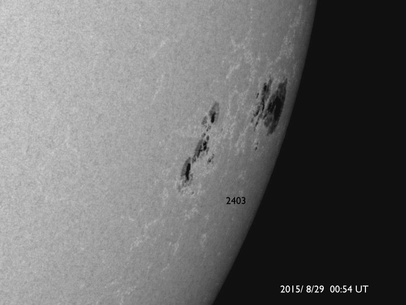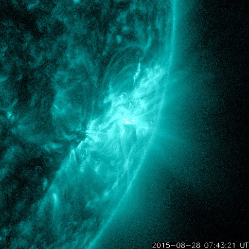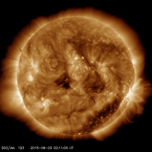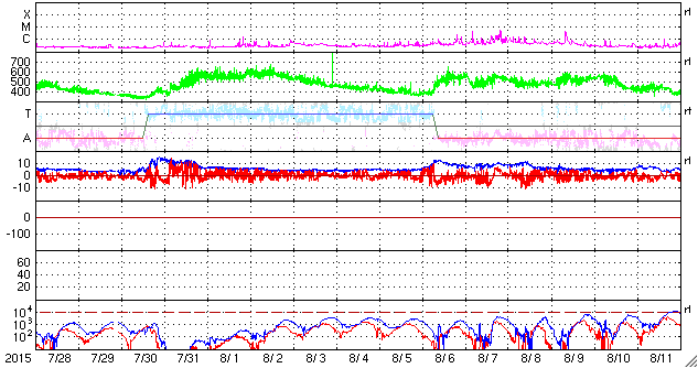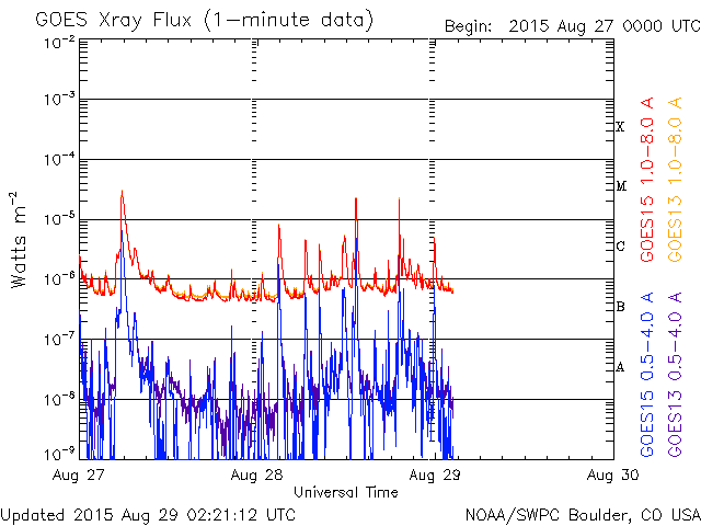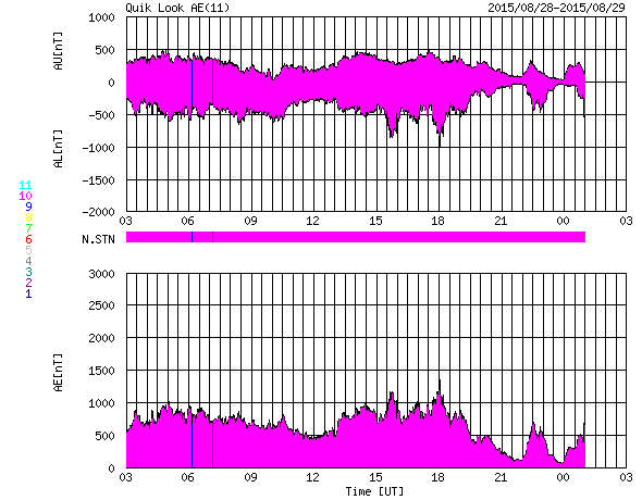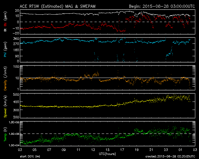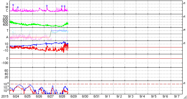 2015/ 8/29 11:21 更新 太陽風の乱れは続き、磁気圏の活動も活発です。2403黒点群でMフレアが2回発生しました。 担当 篠原 太陽風の乱れは続いています。 しかし、今朝くらいからその内容は変わりつつあります。 太陽風の磁場強度は、今朝にかけて15nTに高まった状態が続きました。 29日4時(世界時28日19時)くらいから、下がり始めて、 現在は10nTに落ちていますが、 依然、通常よりも高い値になっています。 磁場に合わせるように、太陽風の速度も変化が起きていて、 昨日いっぱいは350km/秒と低速の状態でしたが、 そこからゆっくりと上昇を始めて、 現在は450km/秒とやや高速です。 コロナホールの影響が及び始めているのかもしれません。 従って、更に速度が高まっていく可能性があります。 太陽風磁場の南北成分は、 今日の未明まで、-10nT近い大きな南向きが続きました。 磁気圏の活発な活動も続いて、 AE指数は800〜1200nTの変化が連続的に発生しています。 しかし、その後磁場が北寄りに切り替わっていて、 AE指数の変化も、後半は弱くなっています。 世界時28日10〜11時頃の、 アラスカ・フェアバンクスのオーロラの動画を掲載します。 AE指数の変化が特に激しい時間帯ではありませんが、 雲が切れた夜空を、オーロラが飾っています。 京都大学のDst指数速報値は、 今回の擾乱で最大 -100nTまで下がっていて、 中規模の磁気嵐になっています。 現在も -60nT前後を推移していて、磁気嵐の状態は続いています。 太陽風は、CMEの乱れから、 コロナホールの乱れに切り替わっている様です。 今後の変化に注目して下さい。 太陽では、2403黒点群の活動が再び活発になっています。 28日22時(世界時28日13時)に、M2.2、 29日4時(世界時28日19時)に、M2.1と、 2つの中規模フレアを起こし、 その他にも、Cクラスのフレアが15回ほど発生しています。 にぎやかに活動する様子を、SDO衛星AIA131の動画で紹介します。 2403黒点群は、太陽の西の端にかなり近付いています。 こちらから見ることのできる最後の活動に注目して下さい。