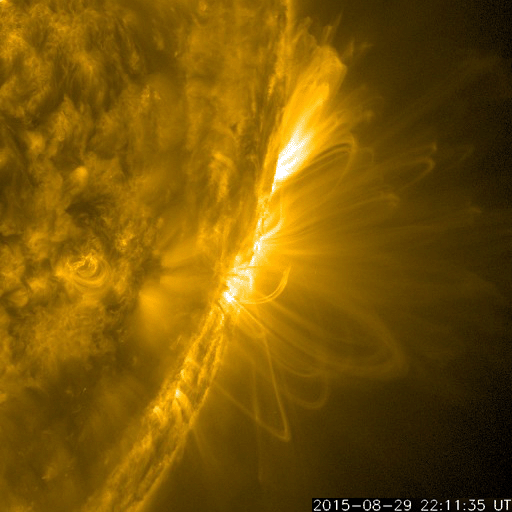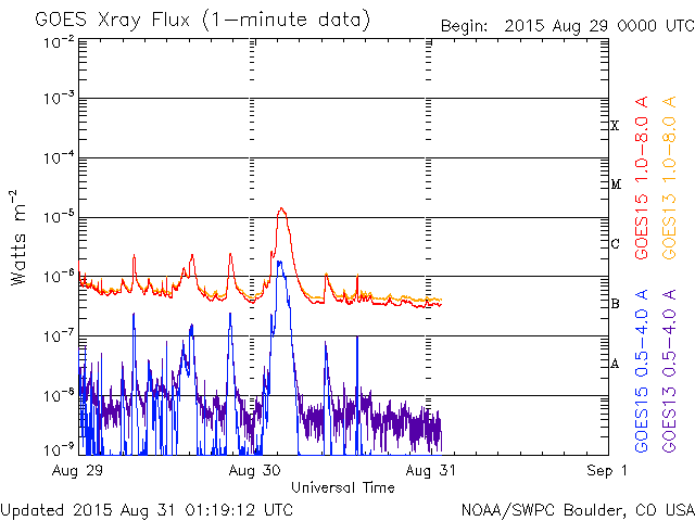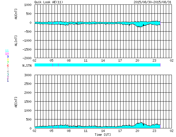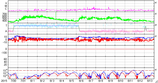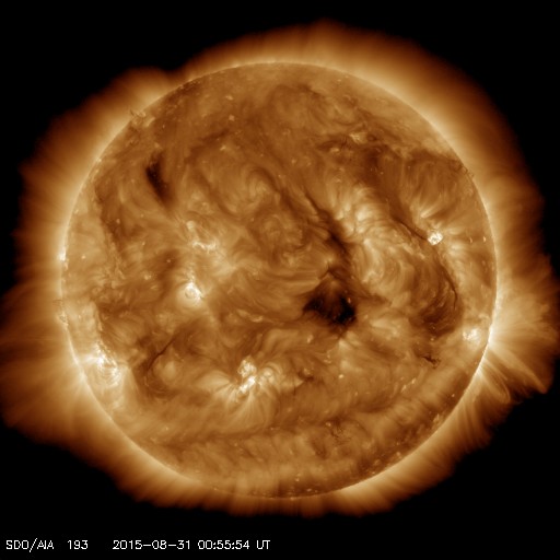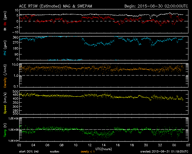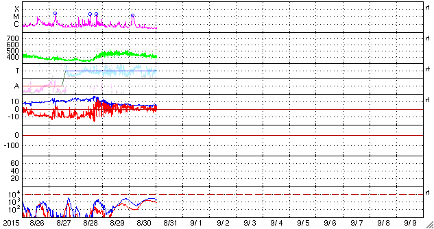 2015/ 8/31 10:20 更新 2403黒点群は見えなくなり、太陽は穏やかです。太陽風も穏やかです。 担当 篠原 2403黒点群は、太陽の向こう側に回って、 見えなくなりました。 2403群で発生した昨日のM1.4フレアの様子を、 SDO衛星AIA171の動画で改めて紹介します。 ループ状にコロナが輝く様子がとてもきれいに見えています。 2403群が没して、太陽面には2406群と2407群の 小さい黒点が見えるだけになっています。 X線グラフの変化も、小さくなっています。 太陽風は、450km/秒から400km/秒へ速度が下がり、 平均的な速さに戻っています。 磁場強度は5nTで安定していて、 コロナホールによる太陽風の高まりは、通り過ぎた様です。 磁場の南北成分は、0nTから北寄りの傾向です。 このため磁気圏も穏やかで、 オーロラの活動度を示すAE指数のグラフは、変化がなくなっています。 27日周期の図を見ると、太陽風の次の高まりが近付いています。 前周期の8月6日に始まる太陽風の変化が、 27日周期で回帰すると、 明後日、9月2日くらいに始まる可能性があります。 SDO衛星AIA193の太陽の中央部に見える コロナホールに関係している変化だと考えられます。