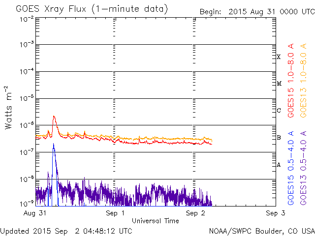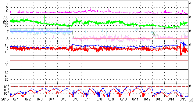 - 2015/ 8/28 12:12 太陽風磁場の強まりと、磁気圏活動の高まりが続いています。M2.9の中規模フレアが起きました。