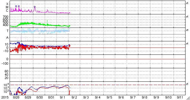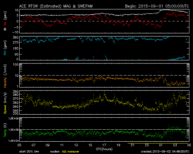 - 2015/ 9/ 1 09:32 太陽風はやや低速になり、磁気圏も穏やかです。