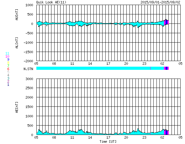 下段のAEグラフの値が高くなると、オーロラ活動が活発化しています。