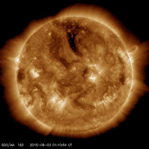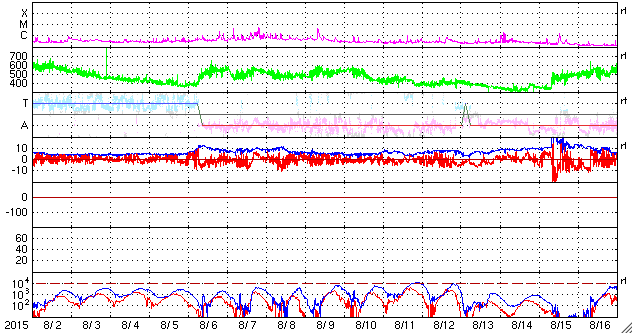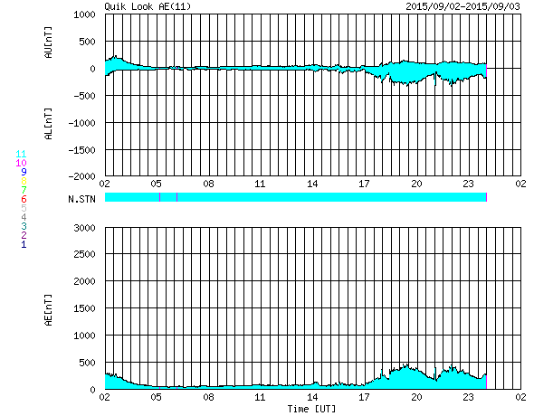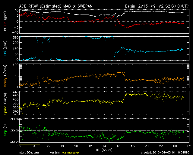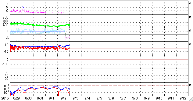 2015/ 9/ 3 10:17 更新 太陽風は平均的な速さで、穏やかです。太陽も静かです。 担当 篠原 27日周期の図を見ると、 太陽風は、3日0時(世界時2日15時)頃に、セクターの切り替わりが到来して、 太陽風磁場の大まかな方向が、 「T:地球から太陽向き」から 「A:太陽から地球向き」に変化しています。 前周期(8月6日)とだいたい同じ頃に発生しています。 この変化に伴って、 太陽風の磁場強度は、5nTから8nTヘ、 速度は、380km/秒から420km/秒へ、それぞれ小幅の変化をしています。 27日前は、500km/秒を超えるくらいまで速度が高まったのですが、 今回はそこまで高まらないかもしれません。 磁場の南北成分は、セクター境界を越えた後から、 振れ幅は小さいですが、南寄りに変わっています。 このため、磁気圏の活動も、その後はやや高まっていて、 AE指数では、グラフの後半に500nT弱の小規模の変化が起きています。 27日前の前周期は、太陽風の高まりが4日ほど続いたのですが、 今回はどうなるでしょうか。 引き続き、太陽風の変化に注目して下さい。 太陽は、フレアの発生はなく、穏やかです。 黒点も、2409群がひとつ見えるだけです。 今日は、四国の新居浜へ移動しています。 新幹線で博多駅を通過しているところです。 鹿児島は雨で、電車が遅れたりしましたが、福岡は晴れています。 これから6日にかけて、高専の学生が集まって行う、 モデルロケット・缶サット大会に参加します。