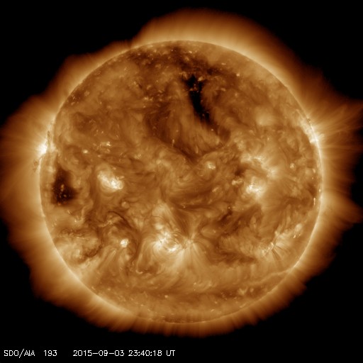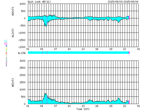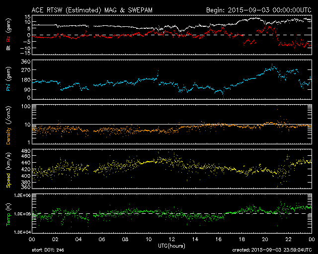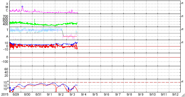 2015/ 9/ 4 09:00 更新 太陽風磁場が強まって、磁気圏の活動を高めています。 担当 篠原 太陽風の速度は、420〜440km/秒と平均的な速さで安定していますが、 今日に入った頃から磁場に変化が見られる様になって、 磁場強度は10nTに上がり、 南北成分も-5nTを超える南向きの状態になっています。 このため、磁気圏の活動も高まりそうです。 今のところ、AE指数のグラフの最後は、 300nTの小規模の変化に留まっていますが、 もう少し規模の大きい変化がこれから見られるかもしれません。 南極の昭和基地で、4日8時(世界時3日23時)頃に撮影されたオーロラを、 全天カメラの動画で紹介します。 空全体を激しくオーロラの光が舞っています。 太陽風の乱れは、速度の変化は小さくなりましたが、 磁場の強まりは残っていた様です。 太陽風磁場の南向きの変化が続くと、 磁気圏の活動も活発に続くでしょう。 太陽は、西の端(右端)でC1.7の小さいフレアが起きただけで、 全体としては穏やかです。 黒点は、小さいものが2か所に新しく現れています。 今日の新居浜は快晴です。 これから、モデルロケット、缶サットの製作講座が行われます。 入門編ですが、高専生たちがどんな機体を作るのか楽しみです。