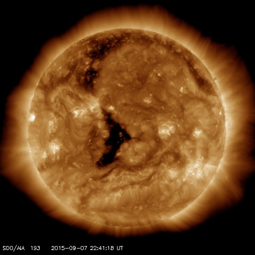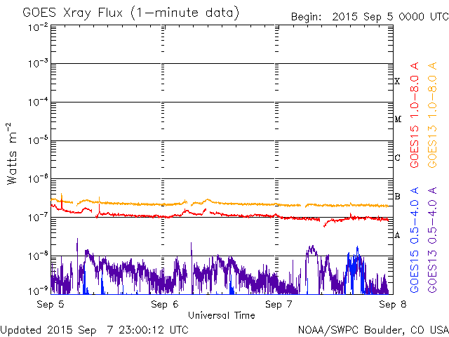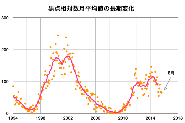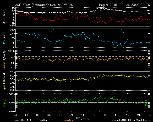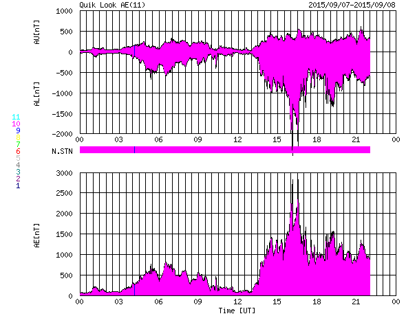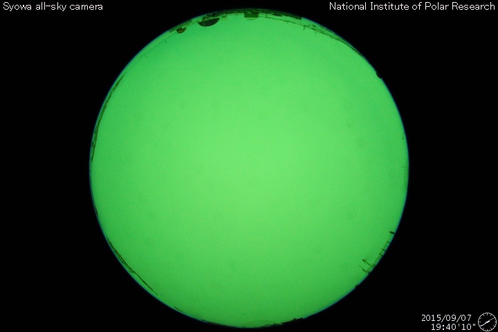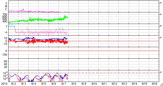 2015/ 9/ 8 08:00 更新 太陽風の乱れが到来して、オーロラの活動が激しくなっています。8月の黒点数は64.6でした。 担当 篠原 WDC-SILSOより、8月の黒点相対数は、64.6 と発表されています。 新居浜出張のため作図ができず、 お知らせするのが遅れてしまいました。 7月の66.4とほぼ同じで、 極小へ向かって下がっていく、 大きな流れに沿った値となっています。 その太陽は、今日も静穏で、 X線グラフには全く変化がありません。 東に現れていた新しい黒点に2412群と番号が付き、 少し大きくなっています。 太陽風は、昨夜、7日21時(世界時)から乱れが到来しています。 磁場強度は、7nTから14nTヘ強まり、 速度も、500km/秒から600km/秒へ高まっています。 6日にお知らせしたCMEによる乱れが、 高速の太陽風に乗って、3日で地球へ到達した様です。 変化の到来とともに、太陽風の磁場が大きく南に振れています。 南北成分は、-10nT前後の強い南向きに振れ、 その前後の半日近く、-5〜-8nTの南向きが続いています。 太陽風の速度が高まっていることと重なって、 磁気圏の乱れはかなり強まっています。 AE指数は、1000〜1500nTの激しい変化が長時間続き、 最大で、2800nTの変化も記録しています。 極域では、激しいオーロラの活動が見られている様です。 南極の昭和基地は残念ながら曇り空で、 雲越しに明るいオーロラの光が見えています。 太陽風磁場の南向きは現在も続いていて、 振れ幅はやや小さくなりましたが、-5nTを保っています。 この状態が続いている間は、 オーロラの活動も高まっているでしょう。 今日の昼の便でタイへ向かいます。
