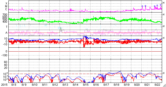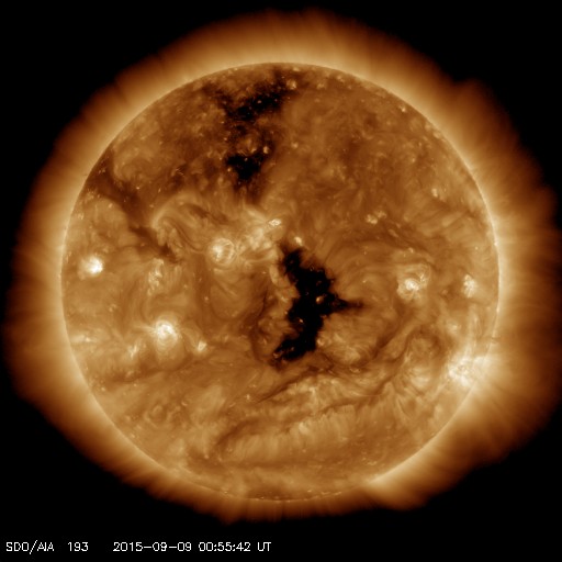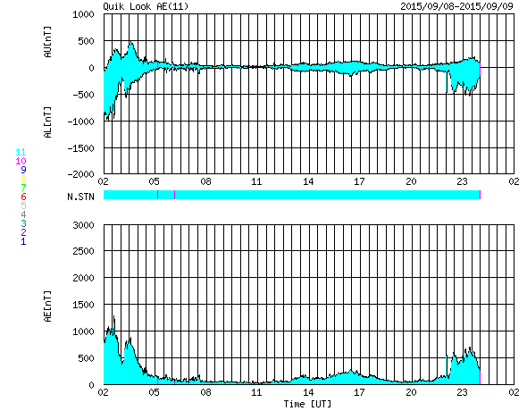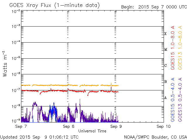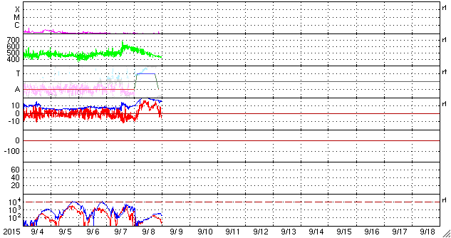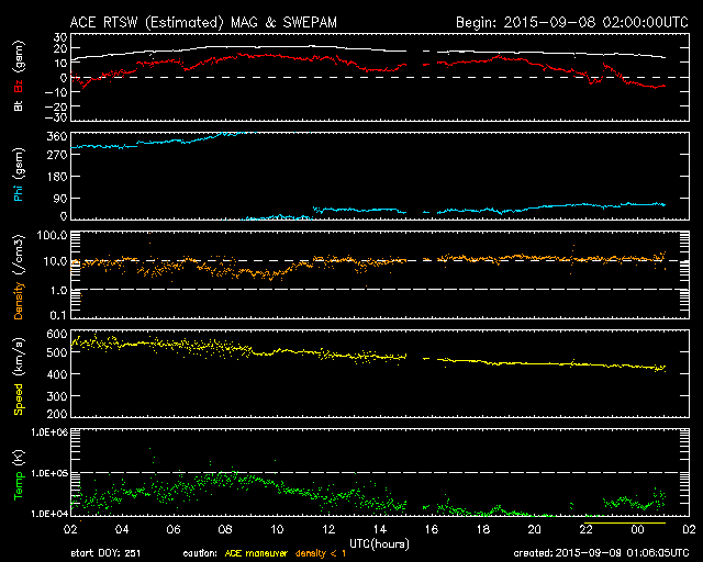 2015/ 9/ 9 10:07 更新 太陽風の磁場が北向きに変わり、磁気圏は穏やかになりました。 担当 篠原 太陽風の乱れは続いていますが、次第に弱くなっています。 600km/秒近くまで高まった速度は、 昨日のニュース以降はゆっくりと低下しています。 現在は430km/秒まで下がり、平均的な状態に戻りつつあります。 一方、磁場強度は、その後も更に高まって、 8日16時(世界時8日7時)には、20nTに達しました。 その状態が5時間ほど続いた後、磁場強度は少しずつ下がり始めましたが、 現在も15nTと強まった状態です。 太陽風の乱れは続いたのですが、 磁気圏への影響を決める太陽風磁場の南北成分は、 8日13時(世界時8日4時)に北向きに切り替わりました。 北向きに変わって、+15nTまで強まったのですが、 磁気圏へのエネルギーの流れ込みはここで一気に弱まることになり、 AE指数は、それまで1000nTを超える変化が続きましたが、 磁場が切り替わった後は、変化がほとんどなくなっています。 ACE衛星の最新のデータでは、磁場は再び南向きになり、 -7nTくらいに強まっています。 この状態が続くと、磁気圏の活動も再び高まるでしょう。 ただし、速度は400km/秒近くに低下し、磁場強度も下がり始めているので、 激しい乱れにはならないと思います。 SDO衛星AIA193では、 コロナホールがちょうど太陽の中心に位置していて、 地球の方向に速度の高い太陽風を噴き出しています 2〜3日後くらいから、太陽風が再び高まりそうです。 太陽は静穏です。 X線のグラフには全く変化がありません。