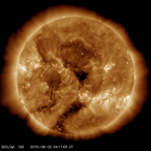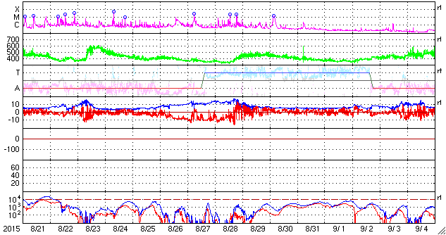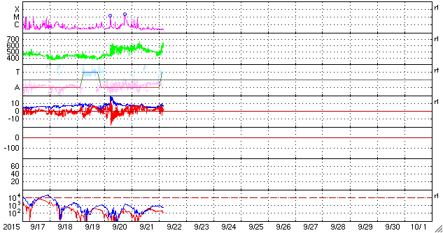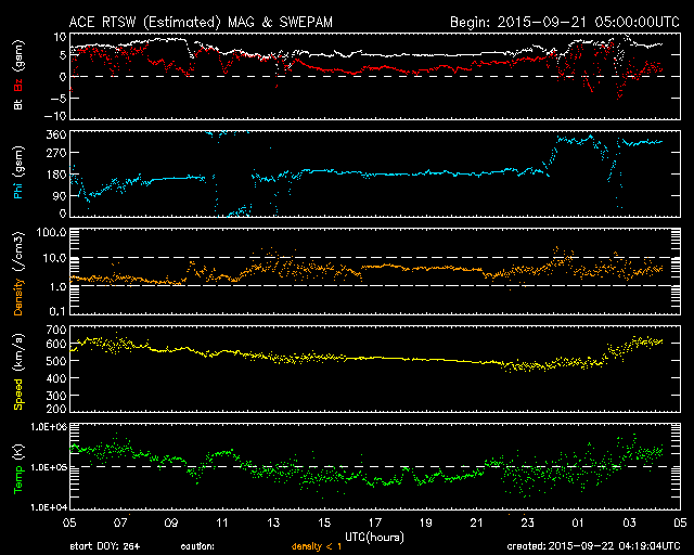 2015/ 9/22 13:20 更新 太陽風は600km/秒の高速風になっています。ムルマンスクのオーロラをどうぞ。 担当 篠原 ロシア・ムルマンスクの福島留美さんより、 9月前半にムルマンスク州各地で撮影された オーロラの写真をいただきました。 この期間、太陽風の影響で、連日オーロラの乱舞が見られ、 多くのオーロラ写真家たちが頑張っていたそうです。 福島さんのコメントとともに、それぞれを紹介します。 1枚目、9月3日、ムルマンスク市、キリル・アレーシン氏撮影。 地平線から天に向かって差し込む強いレーザーみたいなオーロラです。 2枚面、9月8日、アパチット市、オレグ・セメンケーヴィチ氏撮影。 オーロラの大波が押し寄せているようです。 3枚目、9月9日、イマンドラ湖畔、ヴァレンチン・ジガーノフ氏撮影。 ここでは常連さんです。 多分ムルマンスク州イチの腕を持つ、写真家ジガーノフ氏の作品です。 4枚目、9月10日、カンダラクシャ市、イーゴリ・プロゾロフ氏撮影 筋状のオーロラが、小屋の煙突から出ている煙のようです。 ナショナルジオグラフィック・ロシア版にも掲載されたようです。 5枚目、9月12日、モンチェゴルスク市、イーゴリ・マトヴェーフ氏撮影。 こちらも常連さんです。湖面に映るオーロラが美しいです。 6枚目、9月12日、ムルマンスク州、アレクセイ・ワシーリエフ氏撮影。 5枚目と6枚目は同時刻のものでしょう。夜空を羽ばたく大白鳥に見えます。 それぞれの写真に、各撮影者の味付けがされていて、 ずらっと並べると壮観ですね。 多くの方の傑作をありがとうございます。 地上の景色が白くなるのも、もうすぐでしょうか。 太陽風が再度高まっています。 昨日のニュースの後、太陽風の速度は600km/秒に上がりましたが、 その後ゆっくりと低下して、 今朝には500km/秒を割るくらいになっていました。 しかし、22日11時(世界時22日2時)頃から上昇を始めて、 現在、600km/秒に再び達しています。 磁場強度も、今朝には5nTと平均的な値に下がっていましたが、 現在は、8nTにやや強まっています。 磁気圏への影響度を決める太陽風磁場の南北成分は、 昨日以降、北寄りの傾向が続いています。 このため、今のところ磁気圏の活動は穏やかで、 AE指数は特に変化のない状態が続いています。 ただし、今朝の太陽風の強まりでは、 磁場が南を向く変化も発生しています。 この傾向が強まると、磁気圏への影響も大きくなるでしょう。 太陽では、東の2420黒点群の活動が続いていて、 C4.2、C8.8の小規模フレアを起こしています。 引き続き注目して下さい。 ![]() 9月3日にロシア・ムルマンスク市で撮影されたオーロラ。 (c) 福島留美氏、キリル・アレーシン氏 ![]() 9月8日にロシア・ムルマンスク州アパチット市で撮影されたオーロラ。 (c) 福島留美氏、オレグ・セメンケーヴィチ氏 ![]() 9月9日にロシア・ムルマンスク州イマンドラ湖畔で撮影されたオーロラ。 (c) 福島留美氏、ヴァレンチン・ジガーノフ氏 ![]() 9月10日にロシア・ムルマンスク州カンダラクシャ市で撮影されたオーロラ。 (c) 福島留美氏、イーゴリ・プロゾロフ氏 ![]() 9月12日にロシア・ムルマンスク州モンチェゴルスク市で撮影されたオーロラ。 (c) 福島留美氏、イーゴリ・マトヴェーフ氏 ![]() 9月12日にロシア・ムルマンスク州で撮影されたオーロラ。 (c) 福島留美氏、アレクセイ・ワシーリエフ氏 ![]() SDO衛星のAIA193カメラによる太陽コロナの様子 (c) SDO (NASA) ![]() SDO衛星による太陽の可視光写真。マウスの矢印を写真に重ねると、黒点番号付きの写真に切り替わります。 (c) SDO (NASA) ![]() ACEが観測した太陽風の磁場(1番上の枠、白線は全体の強度、赤線は南北成分) および、太陽風の密度(3番目の橙線)、速度(4番目の黄線) (c) NOAA/SWPC ![]() リアルタイムAE指数 下段のAEグラフの値が高くなると、オーロラ活動が活発化しています。 (c) 京都大学, NICT ![]() 27日の太陽周期に合わせたデータプロット 太陽が同じ面を地球に向けていた27日前の変化から、今後を予想することができます。 (c) 作図:宇宙天気ニュース