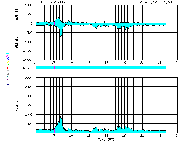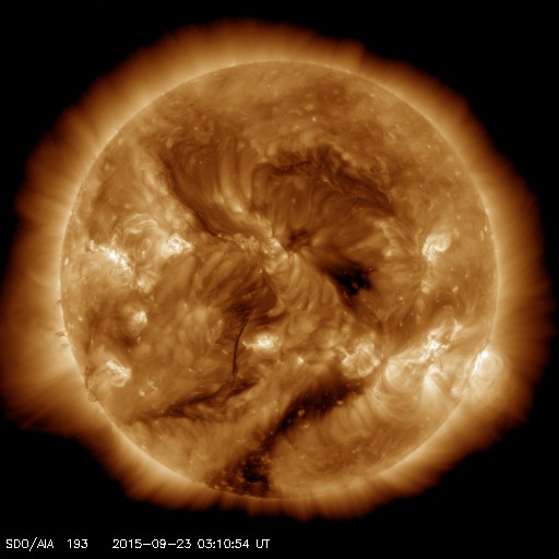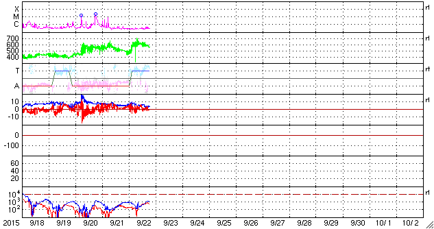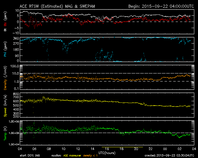 2015/ 9/23 12:30 更新 太陽風の速度は下がり始めています。カナダ・ホワイトホースのオーロラをどうぞ。 担当 篠原 世界時19日9時頃に、 カナダ、ユーコン準州のホワイトホースで撮影されたオーロラの写真を、 小貝哲夫さんよりいただきました。 19日の太陽風は、420km/秒と平均的な速さでしたが、 磁場の南北成分が、-8nTと南向きに強まったため、 AE指数が800nTくらいに変化しました。 その頃のオーロラです。 1、2枚目では、上空の赤い部分から下へ向かって、 オーロラの縦の筋がとても良く見えています。 背景には、ペルセウス座、プレアデス星団、おうし座などの星々が見えています。 そして、3枚目では光の渦が頭上を覆い尽くすように輝いています。 息を飲むような光景です。 小貝さんは、これから更に北上して、 北極圏でのオーロラ観測を目指しているそうです。 旅の途中に素晴らしい写真を送っていただき、ありがとうございます。 現在の太陽風は、昨日の600km/秒から次第に下がって、 480km/秒とやや高速の状態です。 磁場強度も、8nTから5nTへ下がって、 平均的な値に戻っています。 今回の太陽風の高まりは、この辺りで落ち着くのかもしれません。 磁場の南北成分は、北寄りに推移しています。 そのため、磁気圏の活動はあまり高まらず、 オーロラの活動度を示すAE指数のグラフは、 大きく変化している時間が一部ありますが、その他は穏やかです。 SDO衛星AIA193の太陽コロナの写真では、 赤道から南極にかけて縦に伸びるコロナホールが、 太陽の中央を過ぎて、西に進んでいます。 明日か明後日くらいから、この領域の影響が地球へやって来そうで、 再び、オーロラの活動も高まるかもしれません。 太陽は、東側に2421黒点群、2422群が現れ、 中央部にも新しい黒点が発生しています。 しかし、フレアの発生は特になく、 GOES衛星のX線グラフは静かになっています。