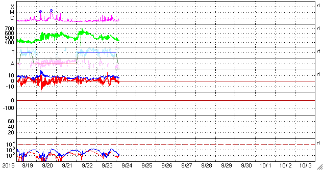 - 2015/ 9/20 09:09 太陽風は平均的な状態です。太陽も穏やかです。