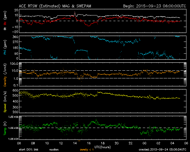 - 2015/ 9/23 12:30 太陽風の速度は下がり始めています。カナダ・ホワイトホースのオーロラをどうぞ。